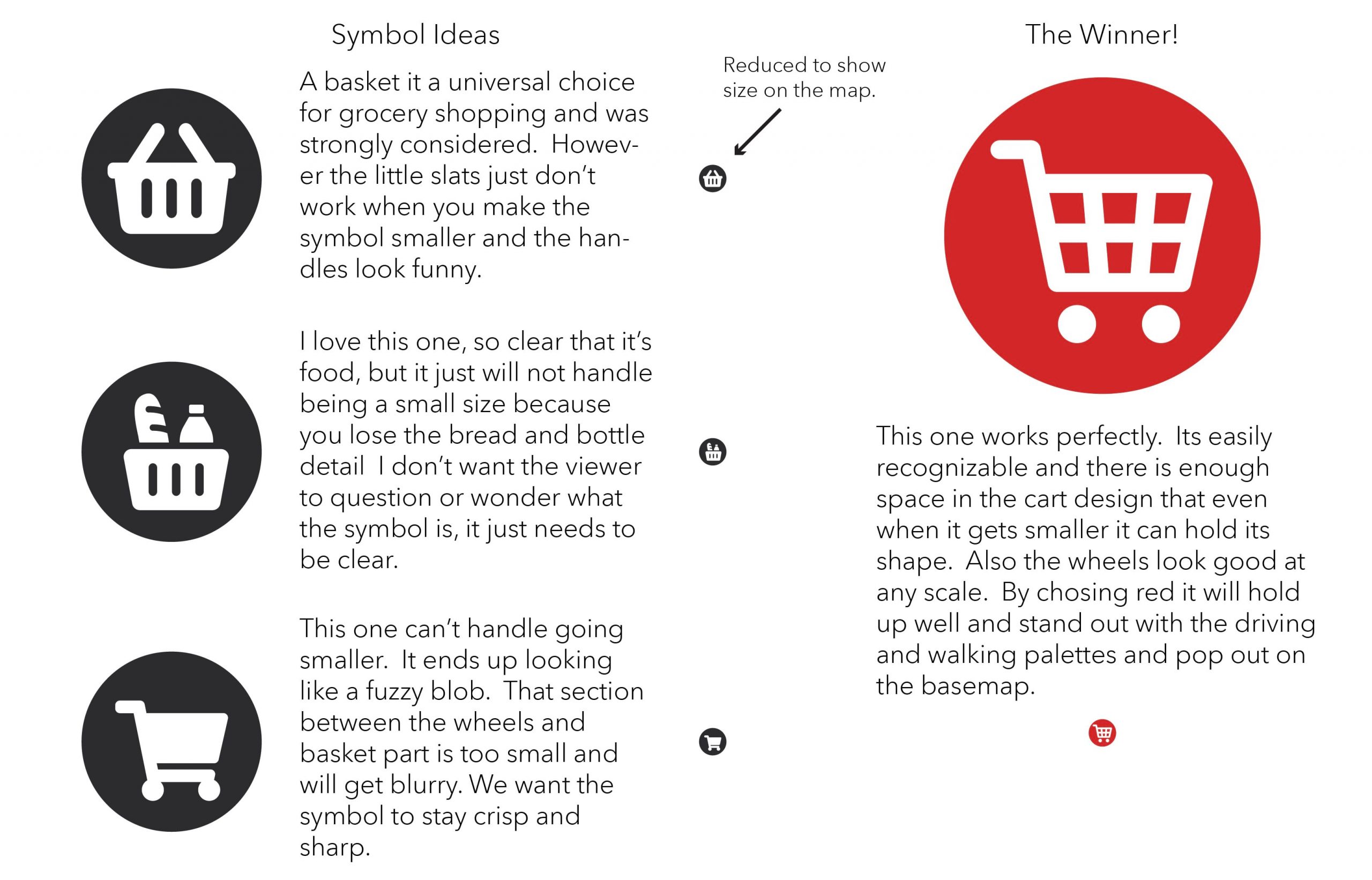 When I picture shopping in a store, I see big bold primary colors with bright lights. I started by doing research on grocery store logos and the color red seemed to stand out. For the actual symbol I wondered if it should it be a classic cart, basket, or another symbol for food?