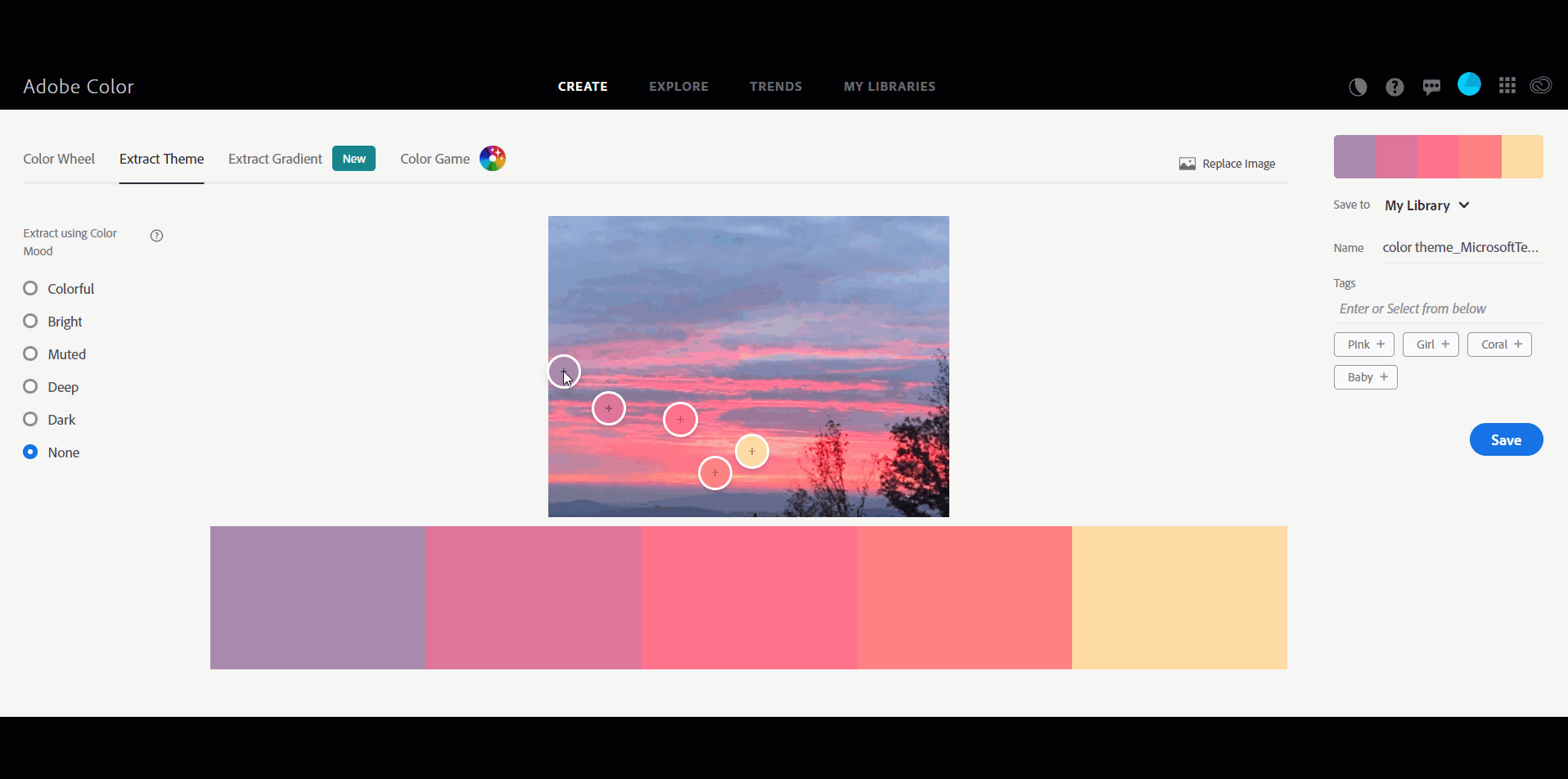 Another tool that’s available online is Adobe Color and it’s just spectacular. Here you can upload a photo, toggle around the image for the colors desired, and then export the palette directly into your Adobe library. How handy! It also makes gradients!