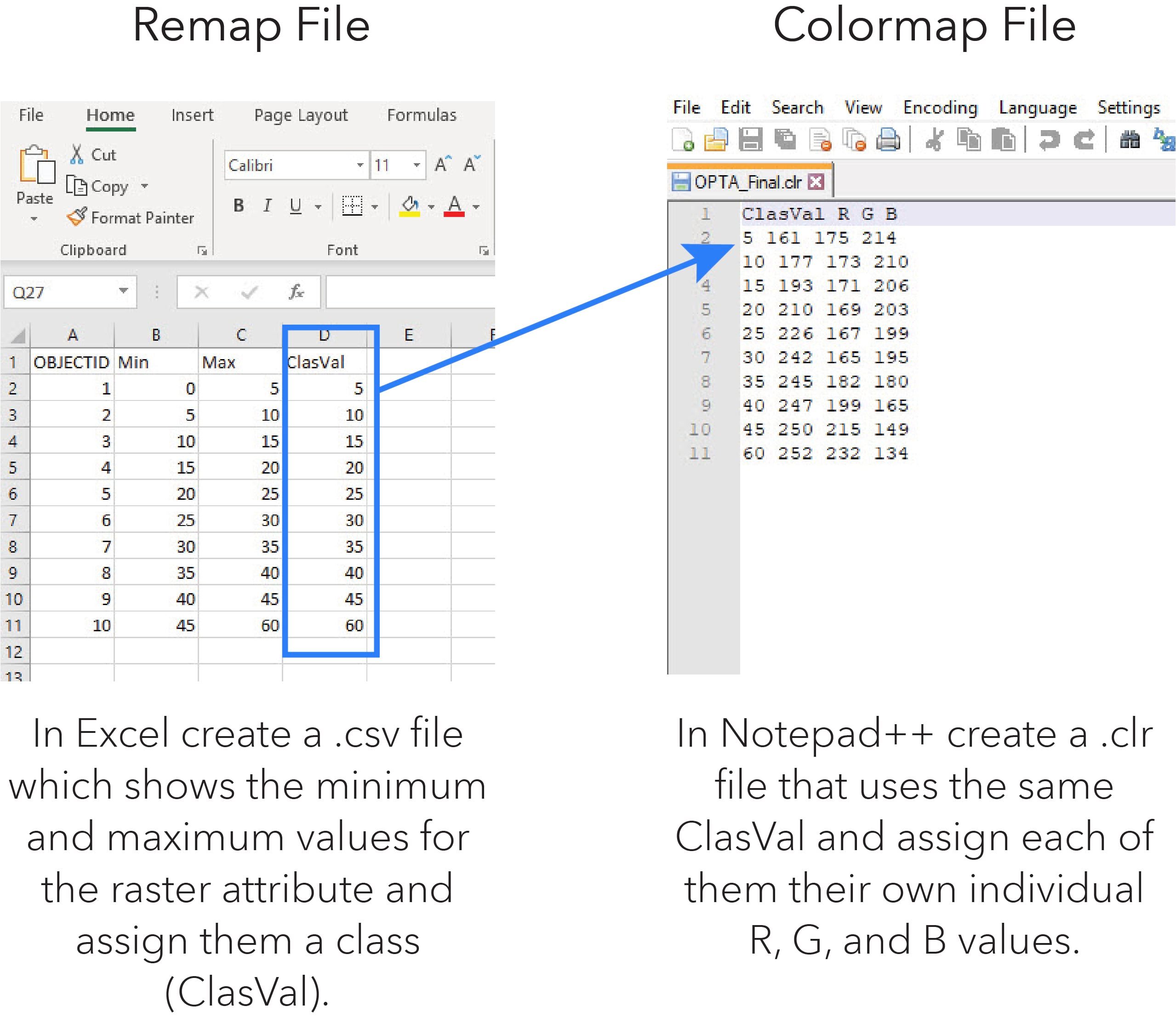 - Develop the two source files needed – one .csv table that contains the data classes and one .clr table of RGB colors for each of those classes.