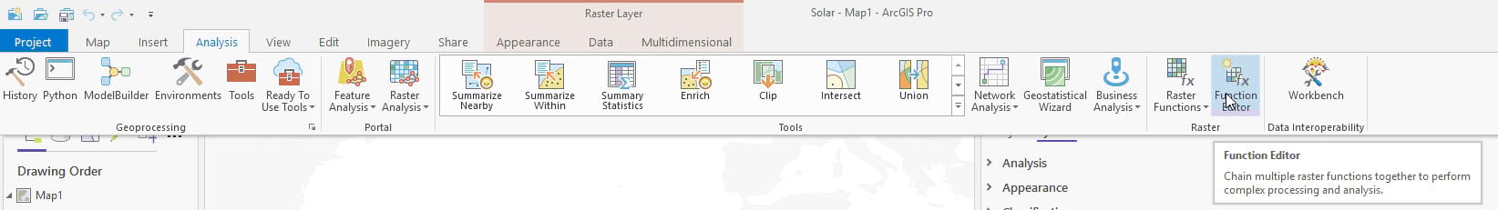 In ArcGIS Pro add in your raster layer and from the ribbon select Analysis – Function Editor.