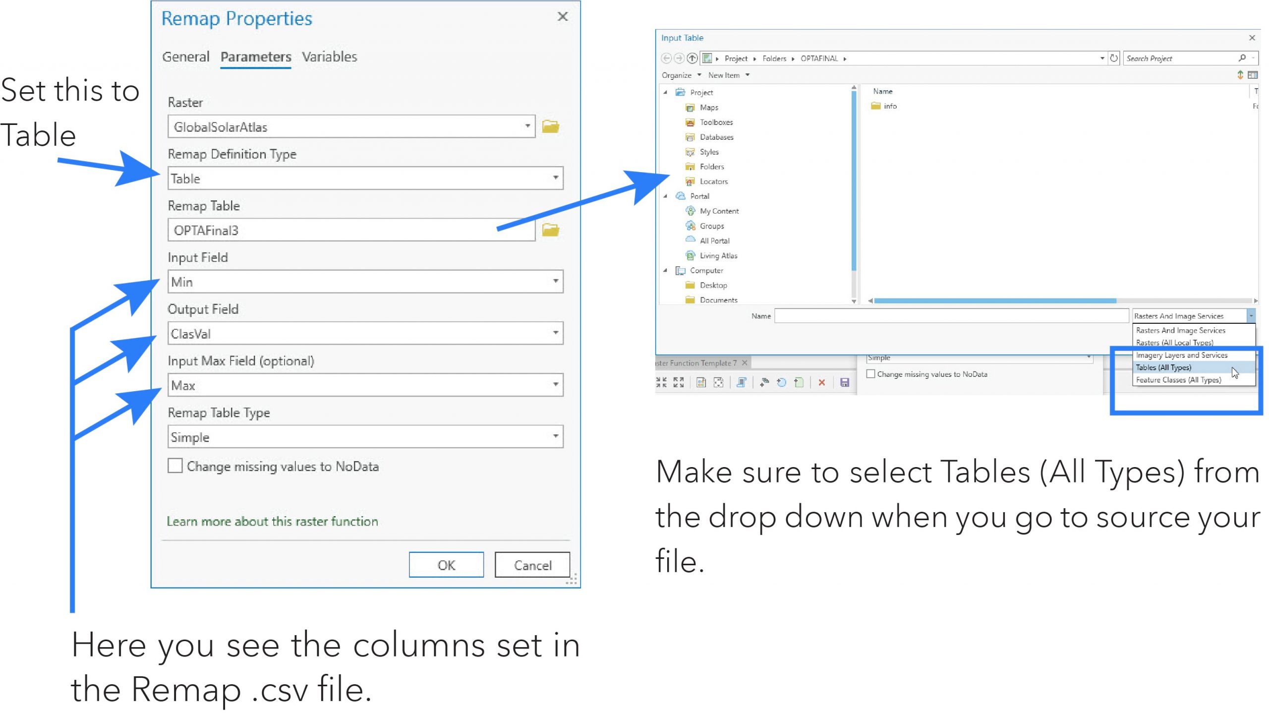 - Build, save, and run the Raster Function Template (RFT) that contains two functions that will pull the information from the two tables.
