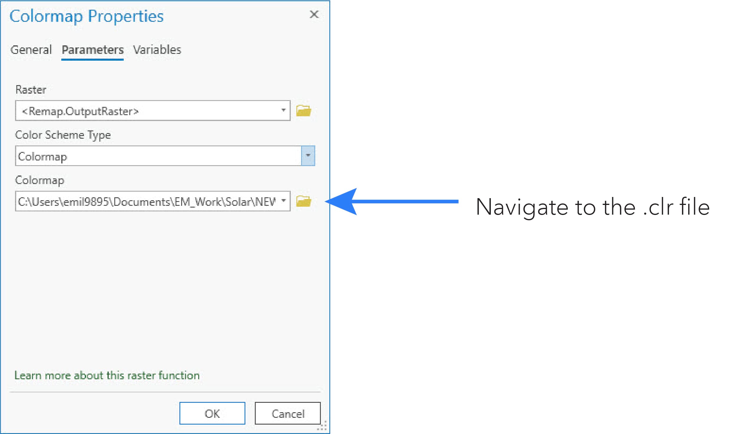 Colormap – This function is a type of raster data renderer. It transforms the pixel values to display the raster data as either a grayscale or a color (RGB) image based on specific colors in a color map file, or based on a color ramp.