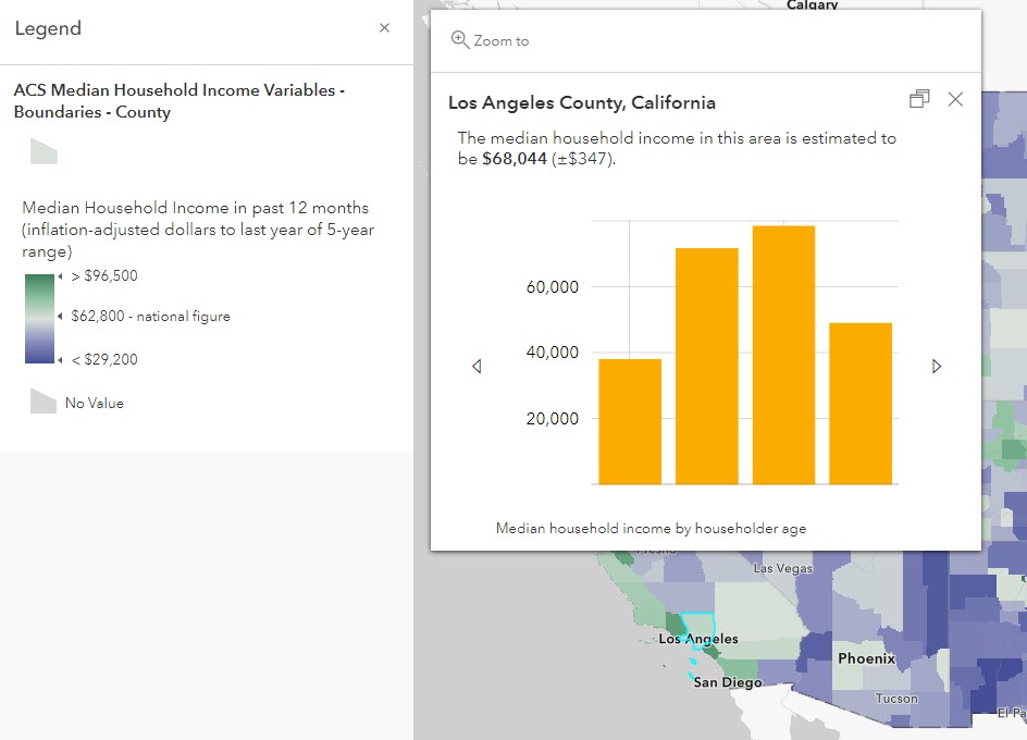 - Updated legends – many of the layers center their map symbols and colors around the national figure of the attribute being mapped, to emphasize areas with higher or lower figures than that national figure. For example, the U.S. median household income is shown as $62,800 currently in that layer’s legend.