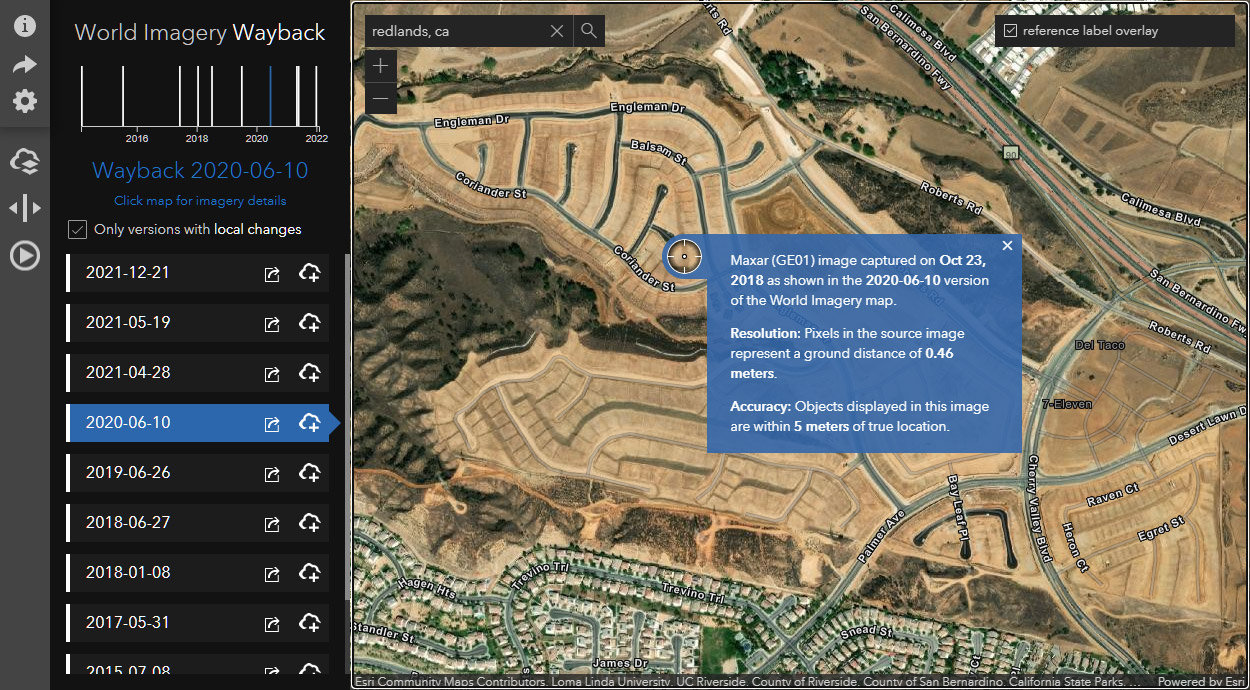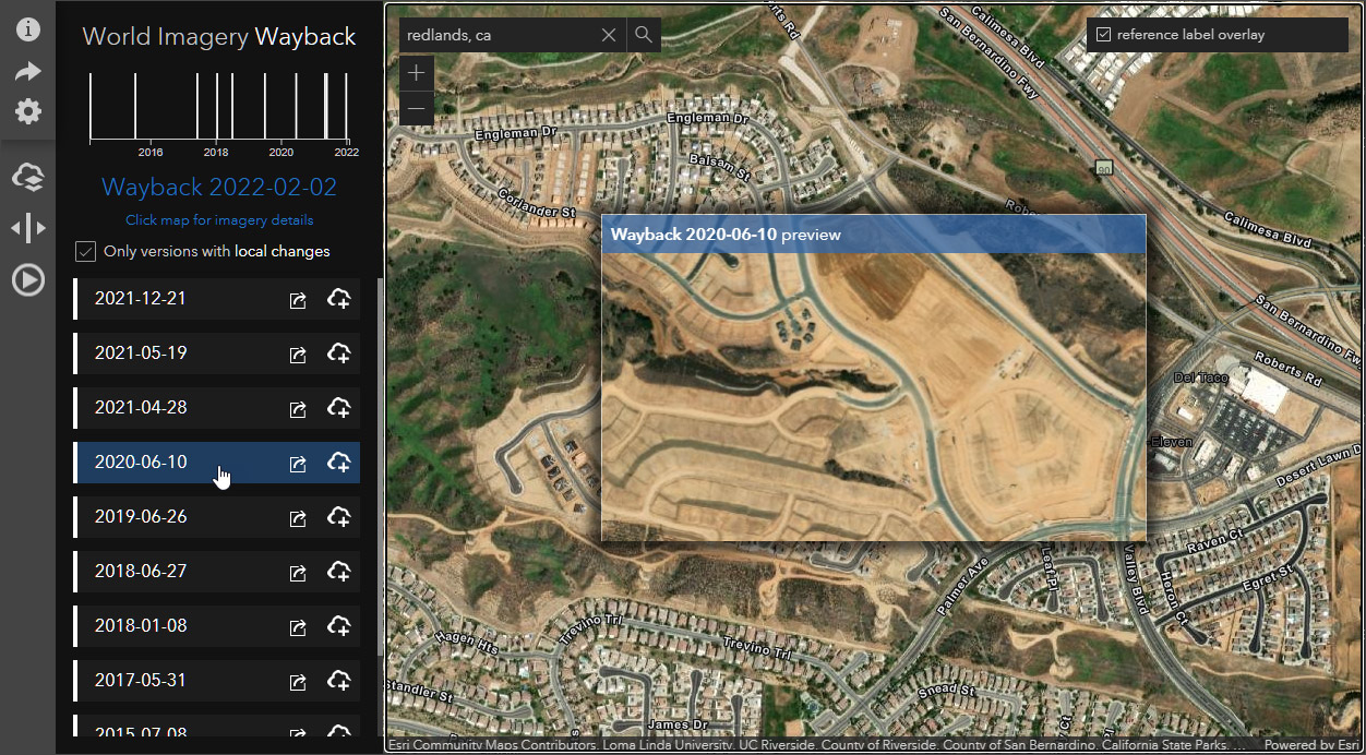 The World Imagery basemap is updated regularly with newer imagery. When and where updates occur, the previous imagery is replaced and is no longer visible. In the vast majority of cases the updated imagery is better, more recent, and is preferred, but there may be exceptions. For example, the previous imagery may better align with your GIS layers, or may offer fewer shadows, clouds, or snow cover. In these cases, you may want to access a previous version of the World Imagery basemap or layers. Another reason is that you may want to go back in time to view change that has occurred as the result of development, fires, or other events.
