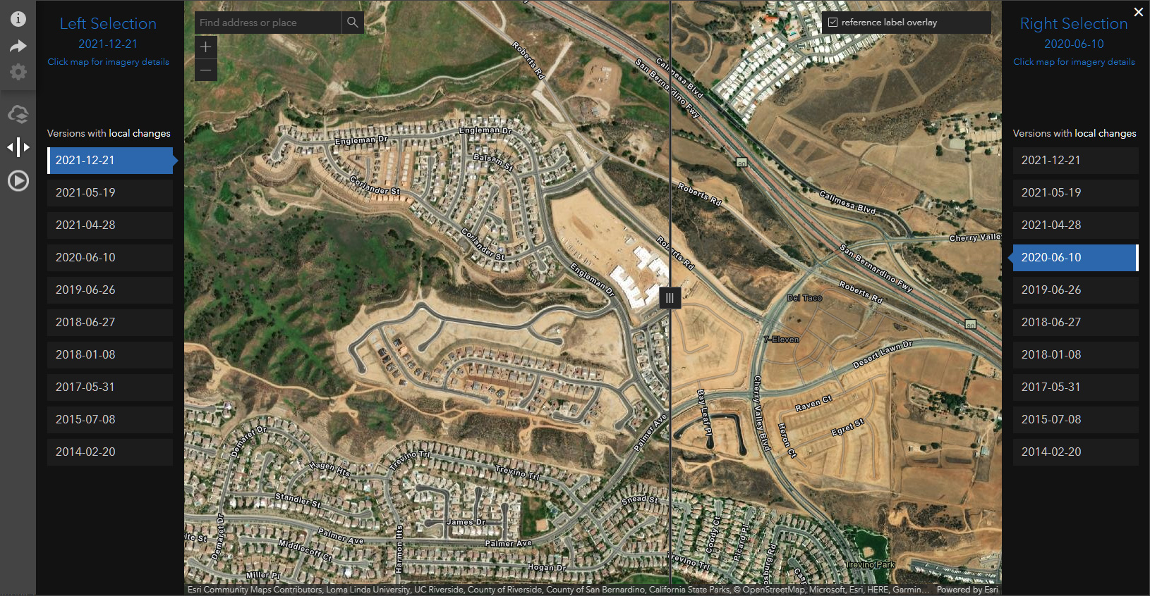 The available imagery is listed on the left and right side of swipe mode. Click to select and display the dates of interest and move the slider to compare the imagery.