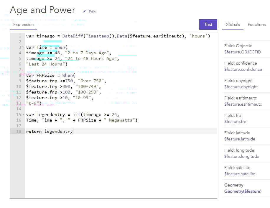 In the arcade expression below, the variable timeago captures the value of the number of hours ago each fire was detected. Using the iif() logical function, we combine the strings for time and power of the fire for the legend if it’s less than 24 hours old. If it’s older than that, the legend string doesn’t include the FRPSize at all. We end up with just seven symbols, we communicate what’s most meaningful without blowing up the legend with too many symbols.