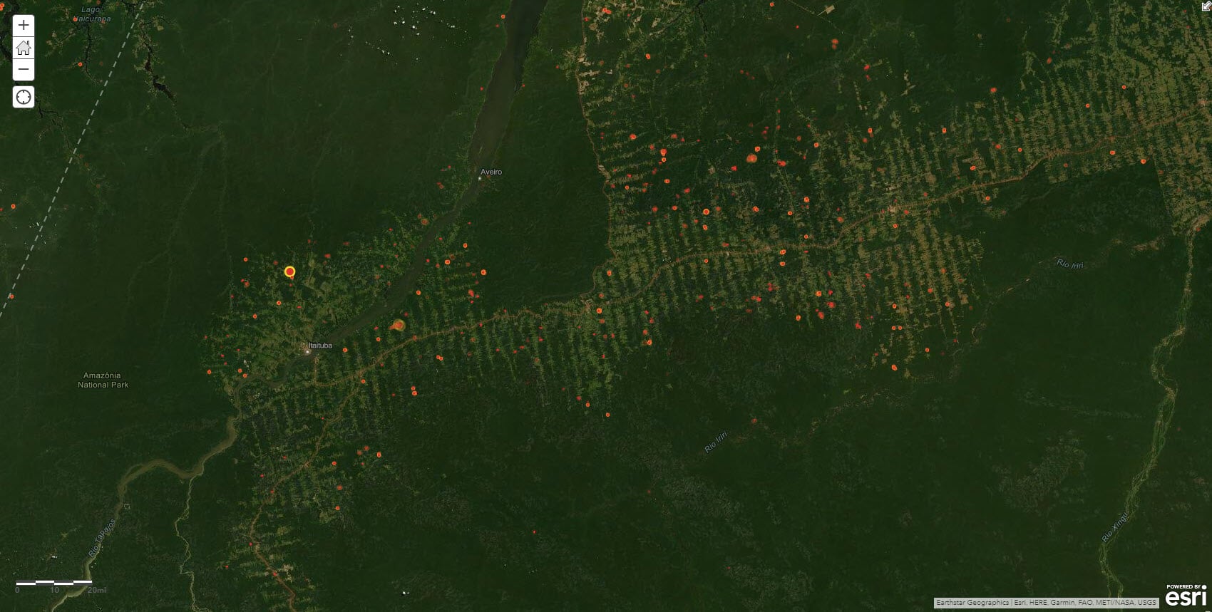 For example, here in Itaituba, Pará, Brazil we can see conversion from forest to farmland taking place, using fire, just to the east of Amazônia National Park.