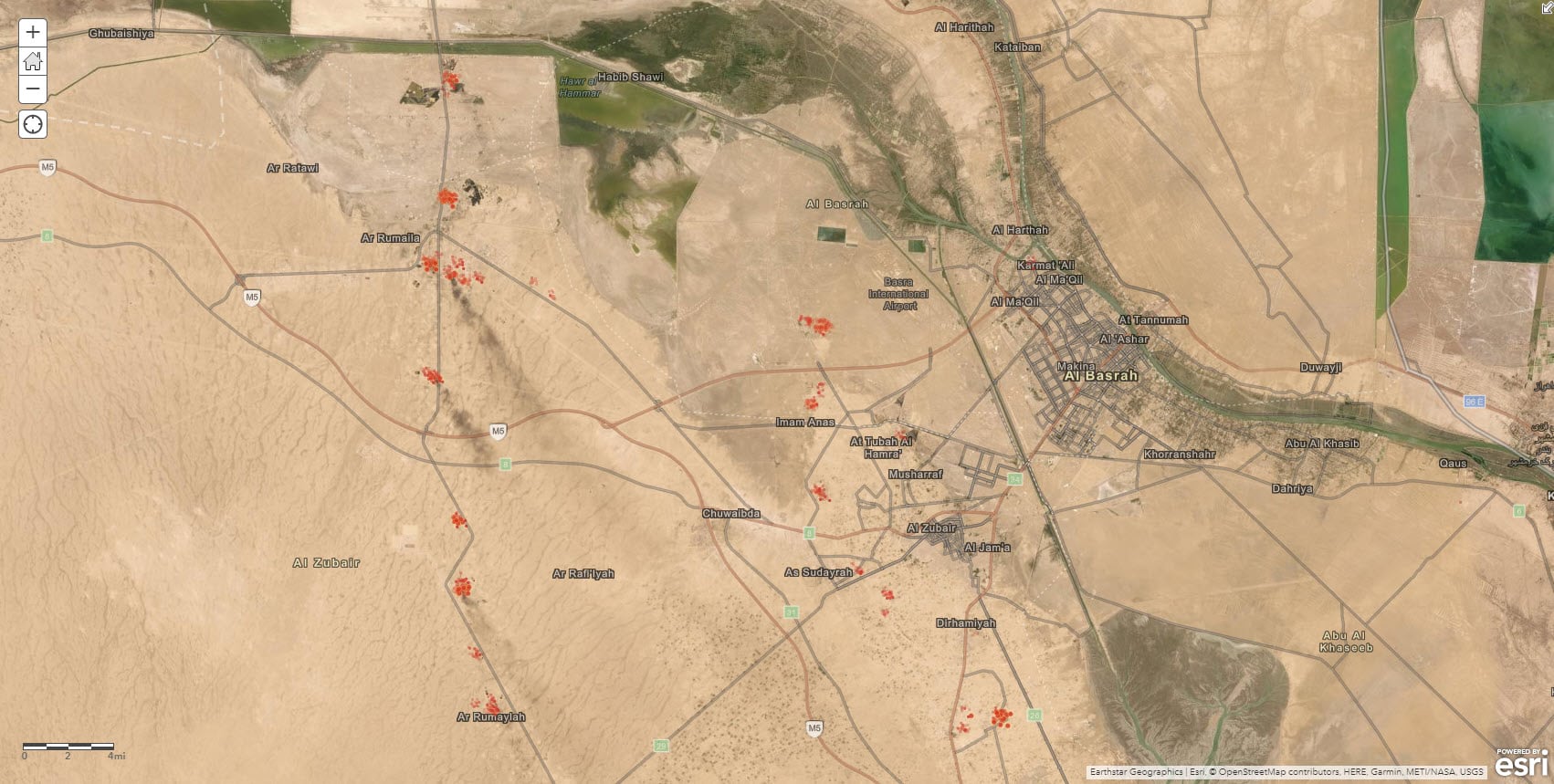 Flaring can be seen where oil and gas production is active like here near Basra, Iraq.