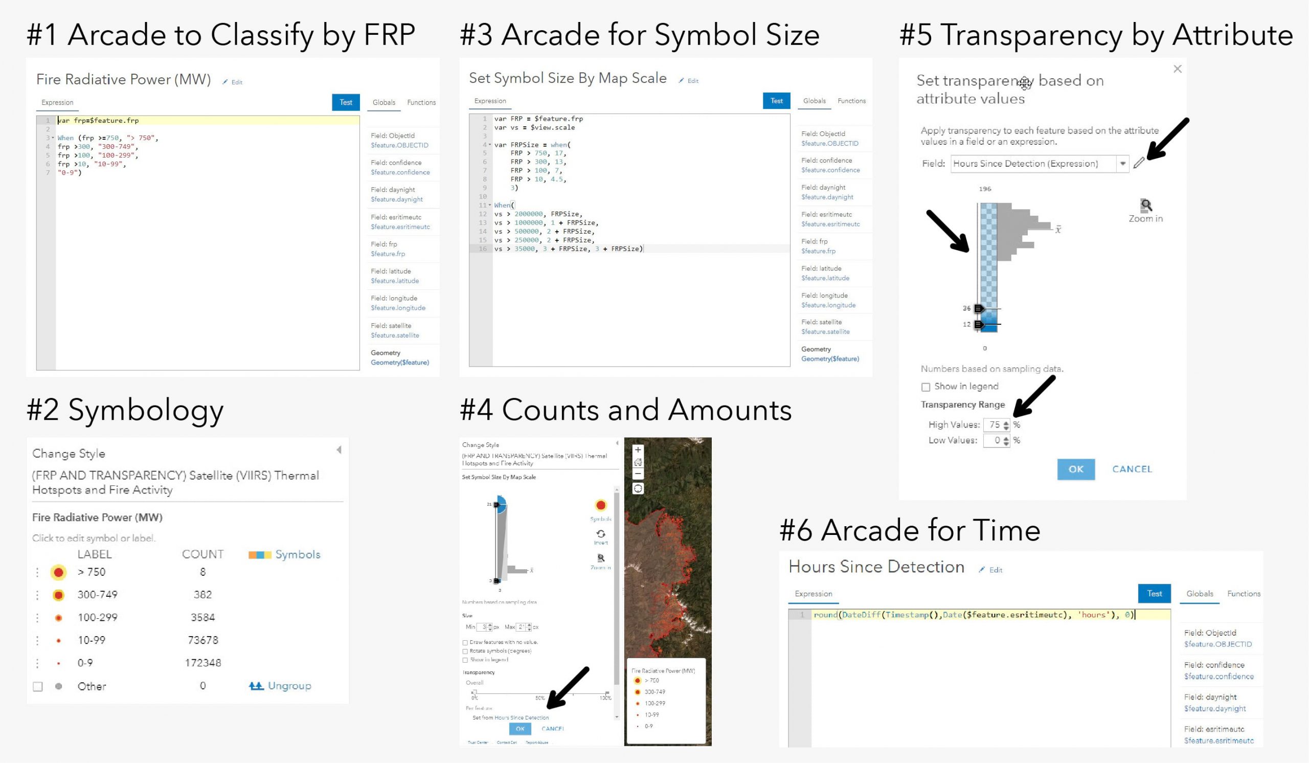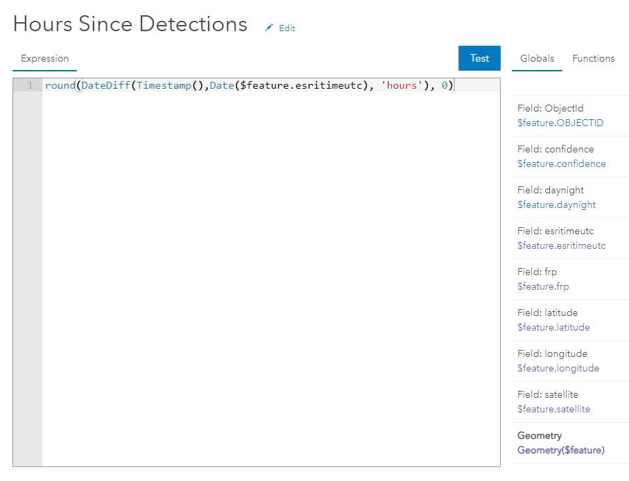 In Arcade we made an expression that symbolizes all the detections by how many hours ago they occurred. This is the most meaningful aspect of time when tracking a fire. Symbolizing by the fire’s date is a bit abstract and can be distracting. Even worse, the satellite detections have their date in Coordinated Universal Time (UTC). This is a global map and there may be detections with tomorrow’s date on them. Using Arcade we can get the time right now in UTC using the timestamp() and datediff() methods to subtract the time in UTC of the detection from the time the actual map is being read in UTC. This is the way to get the UTC time out of the way, and round the number of hours ago the fire was detected to the nearest hour.