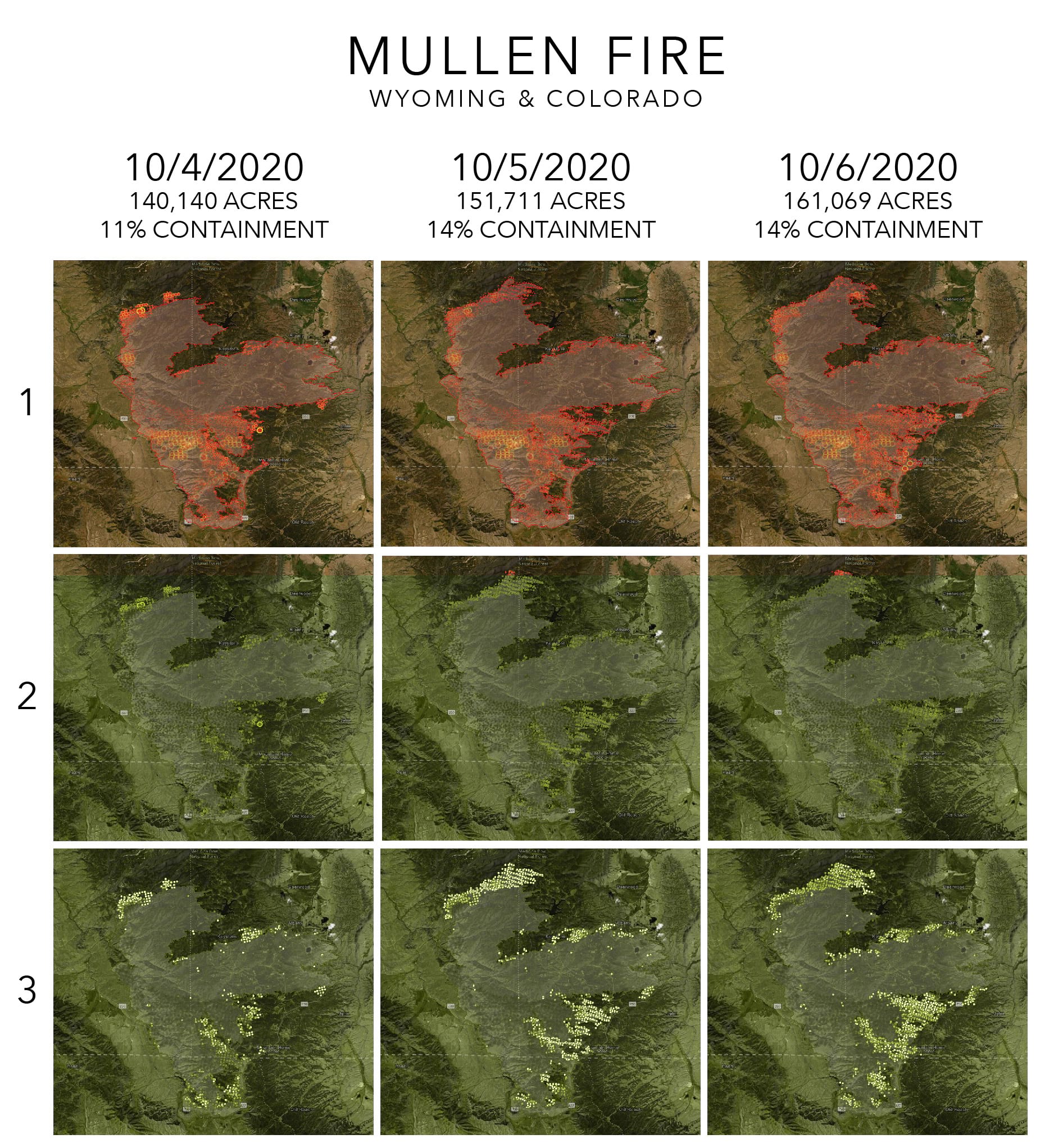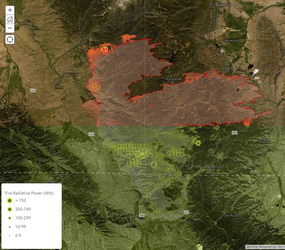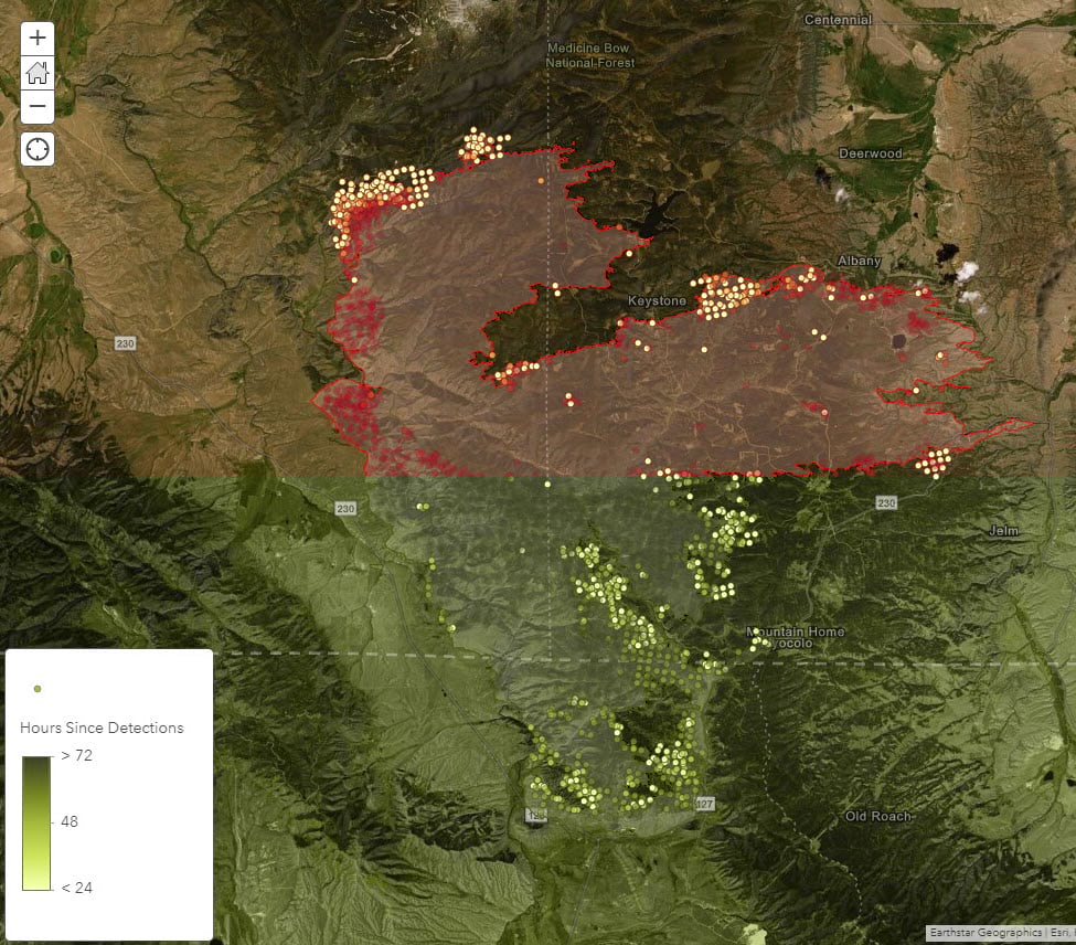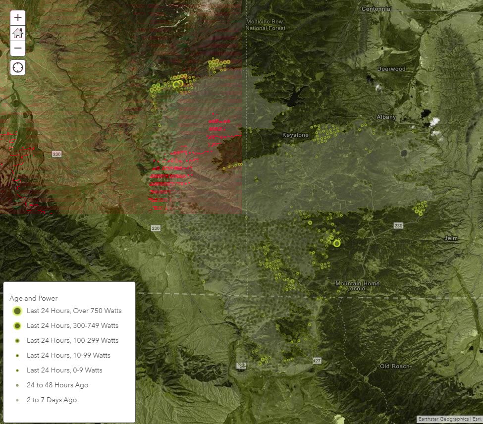 You can see here on the Mullen Fire in Wyoming and Colorado that the big symbols with yellow halos show where the fire was burning with the most power. As time goes by, the points fade away, just like memories do. The places on the fire’s edge with the most current fire detections show up bright red and orange, grabbing your attention.