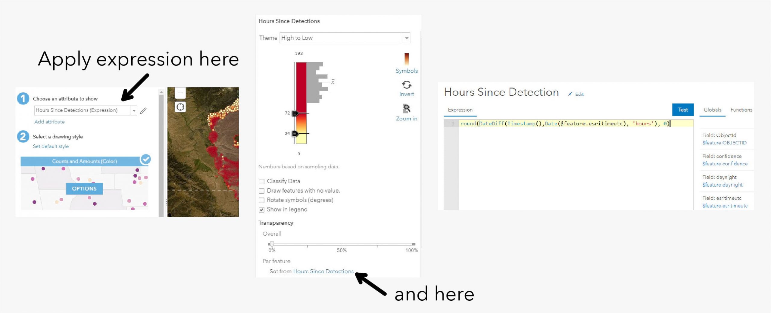 This gives us a much more relatable way to symbolize the map and indicate how current the fire is in the map popups which also leverages this expression.