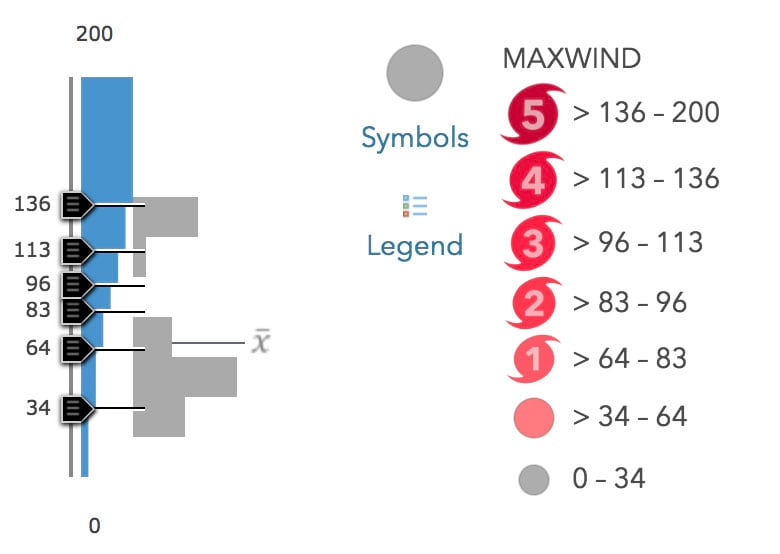 - On the forecast position layer, map the attribute MAXWIND with Counts and Amounts.