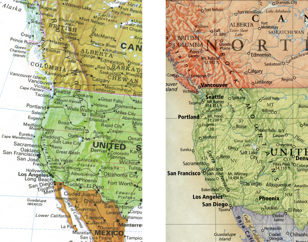 Detail of the ’Tyvek’ map (left) and Rand McNally’s ‘Classic’ wall map (right)