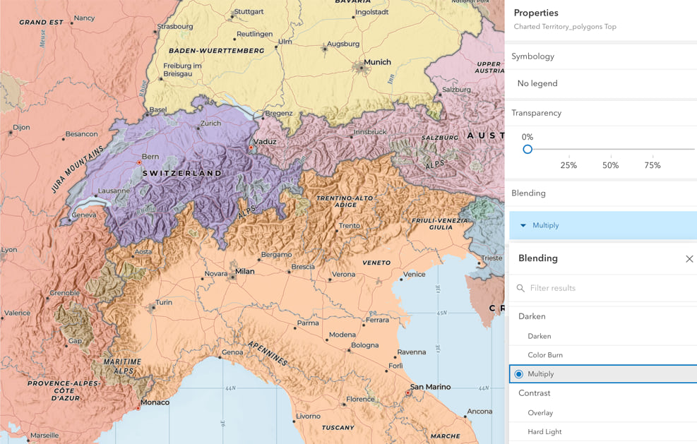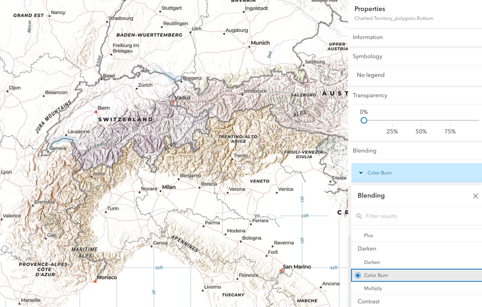 The web map was opened in the new Map Viewer. Using the blending tools, the lower polygon layer was set to ‘Color Burn’. This applied the polygon colors as a subtle tint to the World Hillshade layer below (an interesting effect in itself).