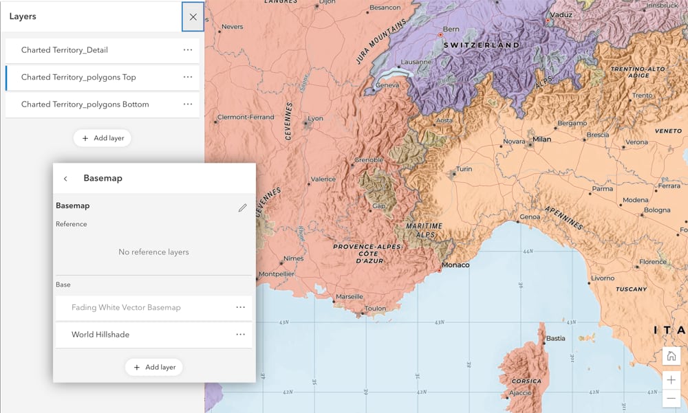 I started by taking the ‘Charted Territory’ basemap (created by Cindy Prostak from the Basemaps Team, and available in the Living Atlas). To get the effect that I wanted, I needed the colored country polygons to be on a separate layer. I used the Vector Tile Style Editor to break them out of the basemap and save them separately (I also took the opportunity to strengthen the colors). The other map detail was saved in a second vector tile layer for adding to the final map.