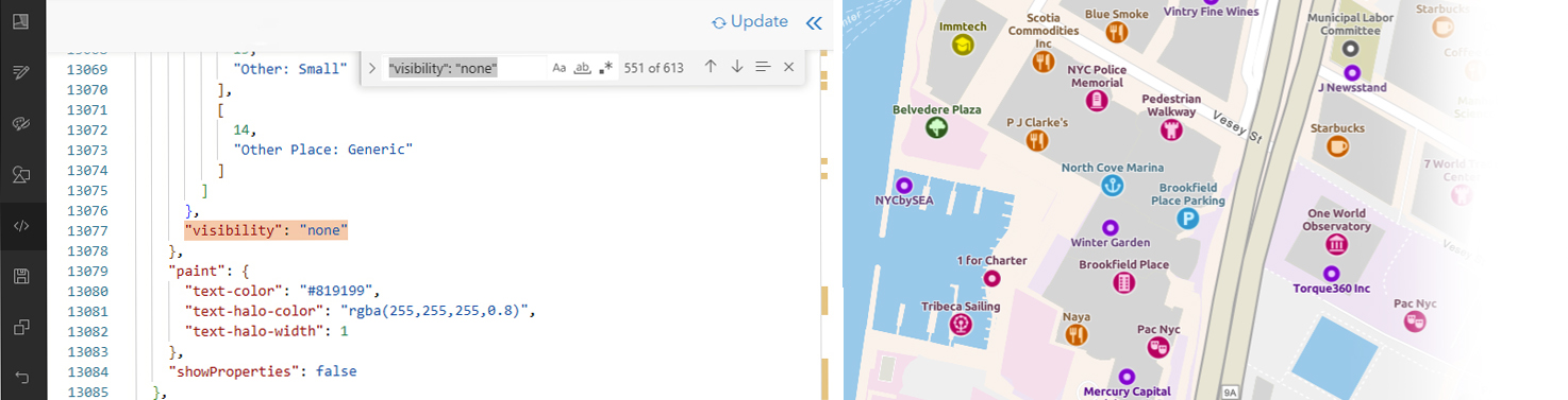 - Go to ‘Edit JSON’, Search (Control ‘F’) for “visibility”: “none”. This will highlight examples of that text in the code. In turn, that identifies the symbol layers that are switched off.