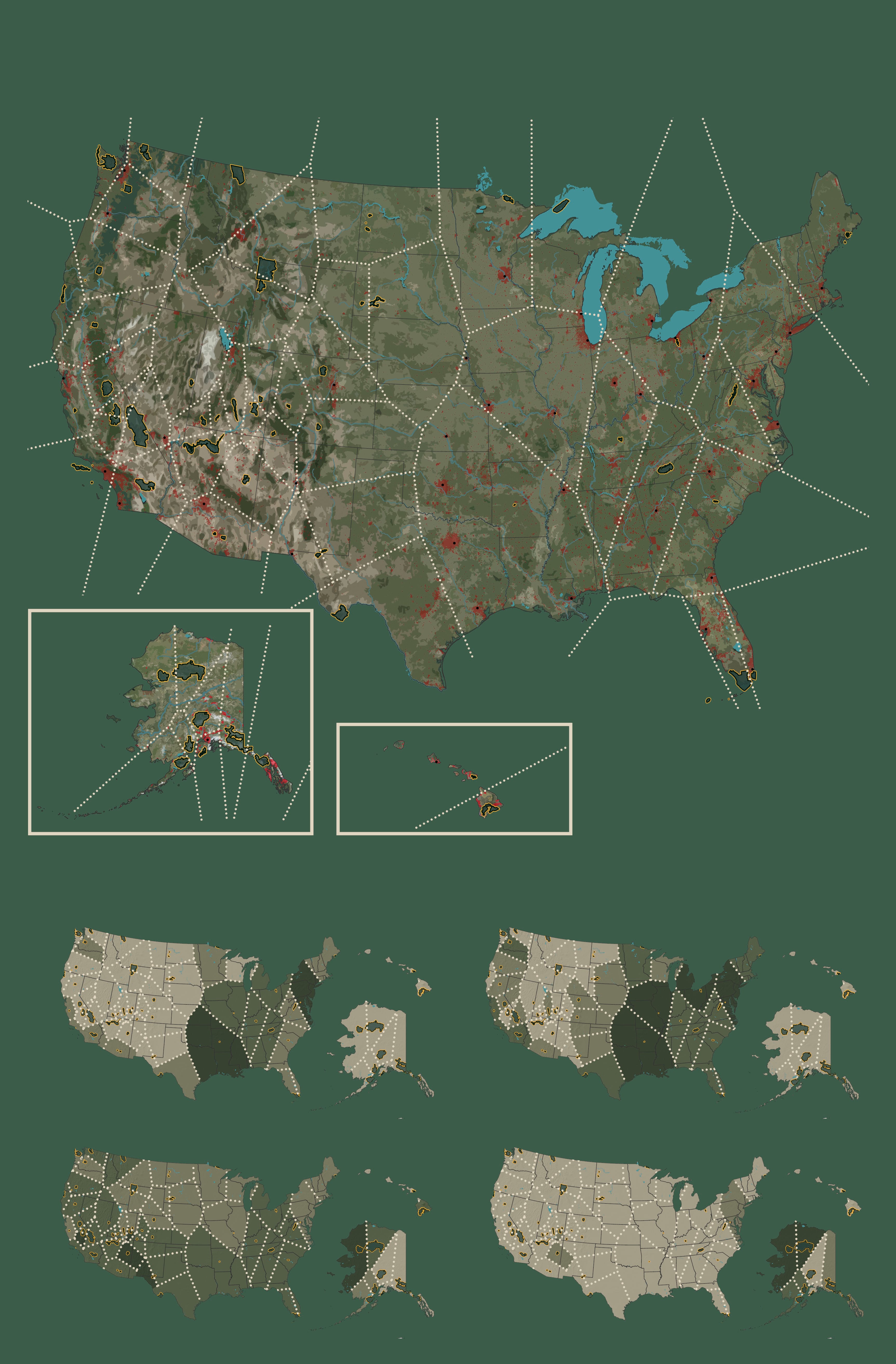This map will have an incredible 15 individual maps! The main focus map will have have the US mainland (1:16,500,000), Alaska (1:77,000,000) and Hawaii (1:15,500,000).