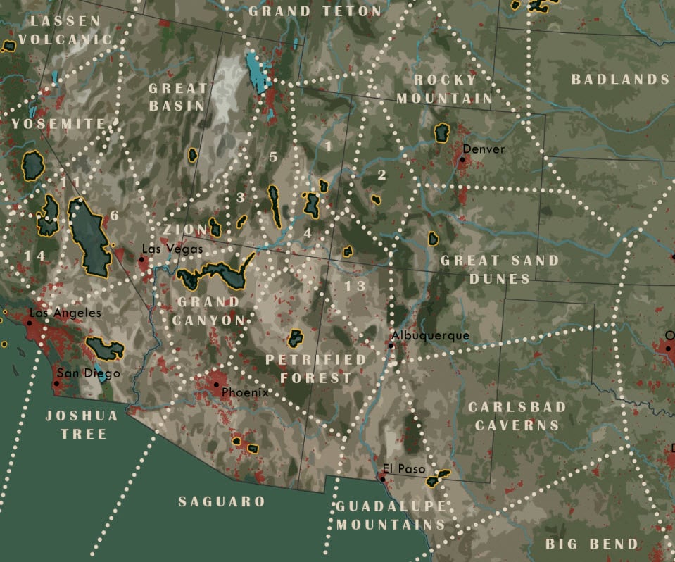 Since this map is about National Parks, why not take those beautiful vintage posters made in the 1930’s and 40’s by the WPA (more on that below) and give this map a nod to their past?