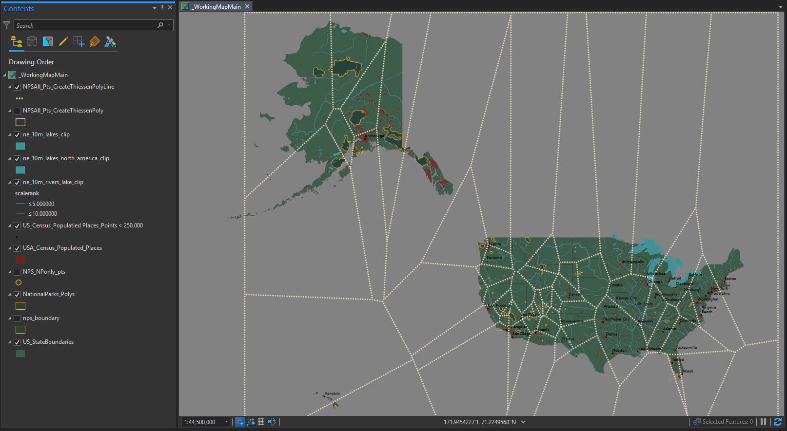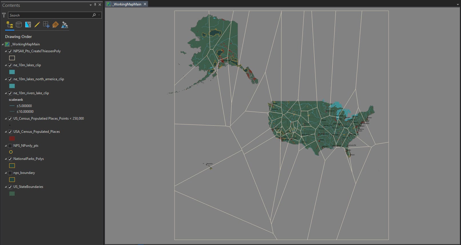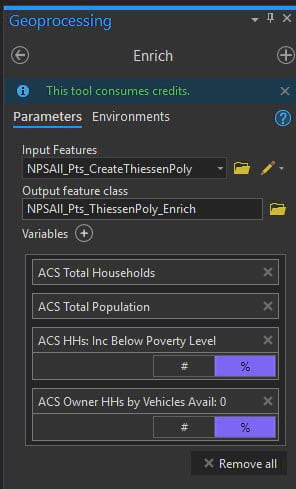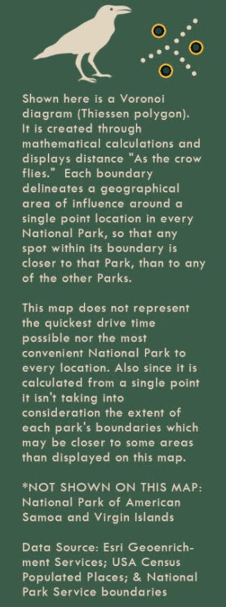 Use ArcGIS Pro to run the Thiessen (Voronoi) polygon tool (this requires an Advanced License) on information from the National Park Service. Then give the map more purpose by enriching it to help understand the circumstances for people living around each park.