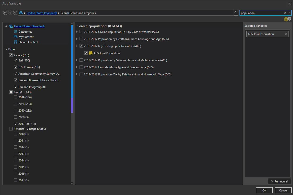 The quickest way to find what you need is to use the Search box (top right) to quickly find the appropriate layer vintage. Next uncheck the boxes for the dates you do not need. This example shows how to search for population from 2013-2017.