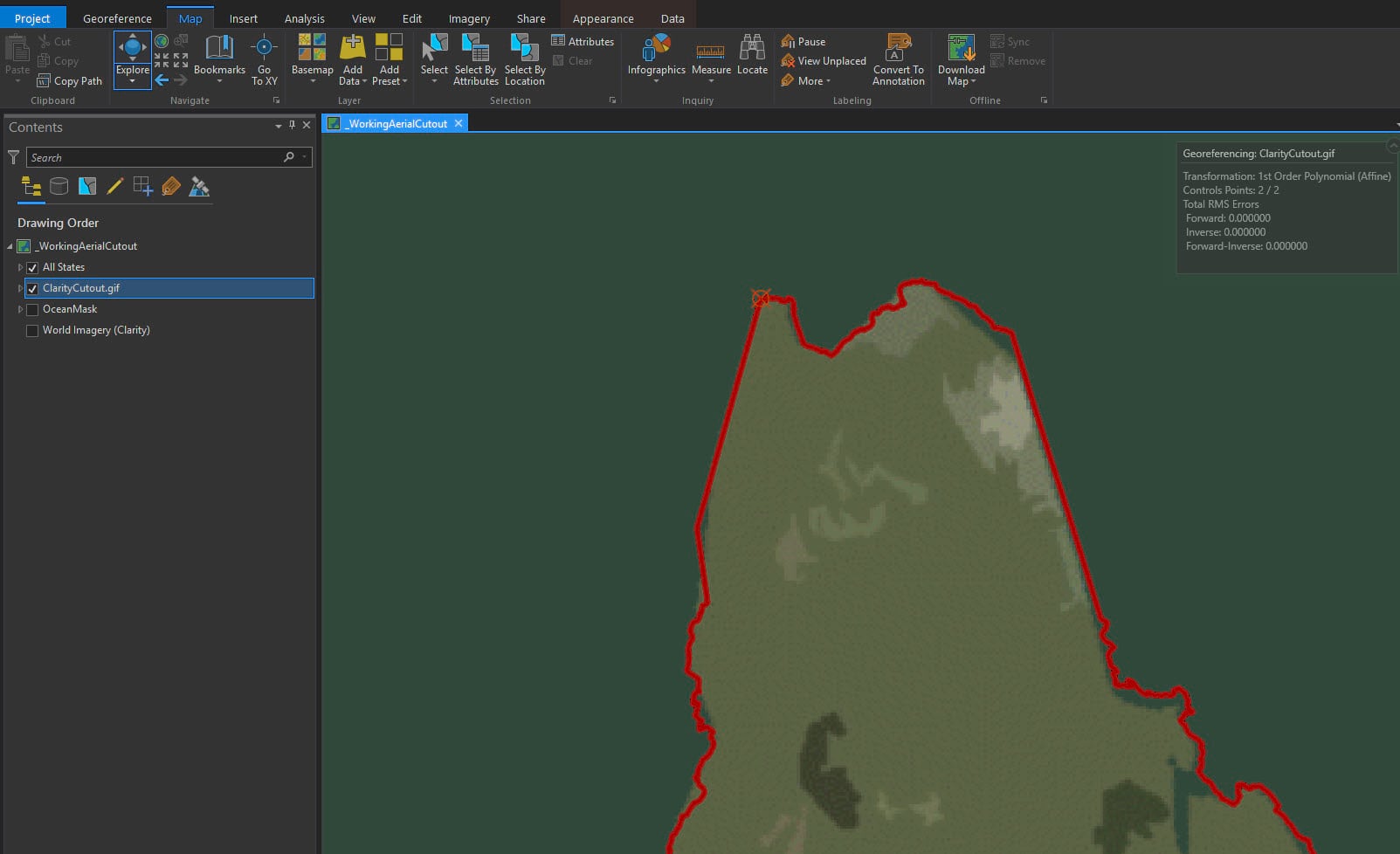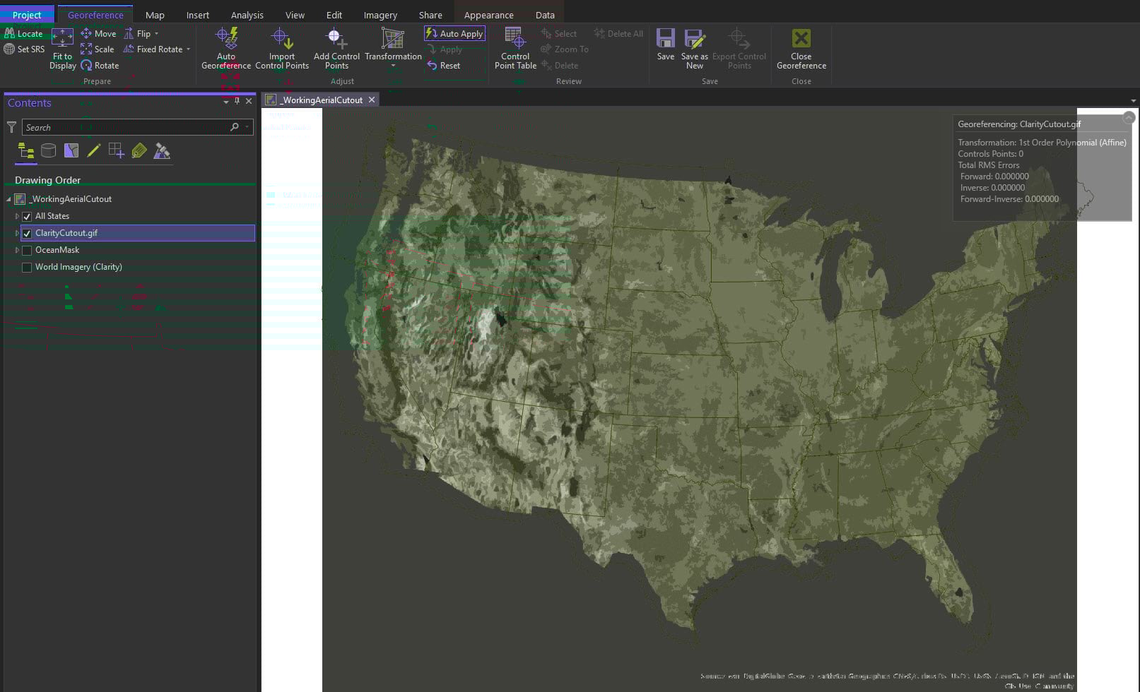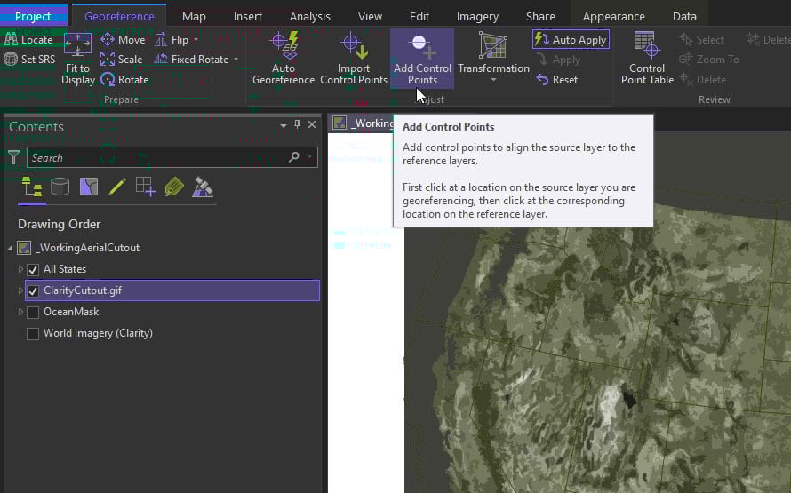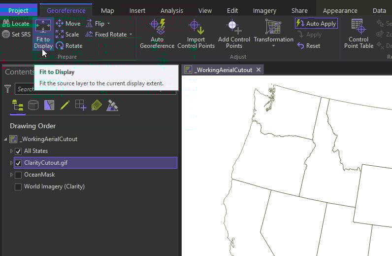 The tool is intuitive and the ribbon changes to reflect georeferencing options. Select Fit to Display.