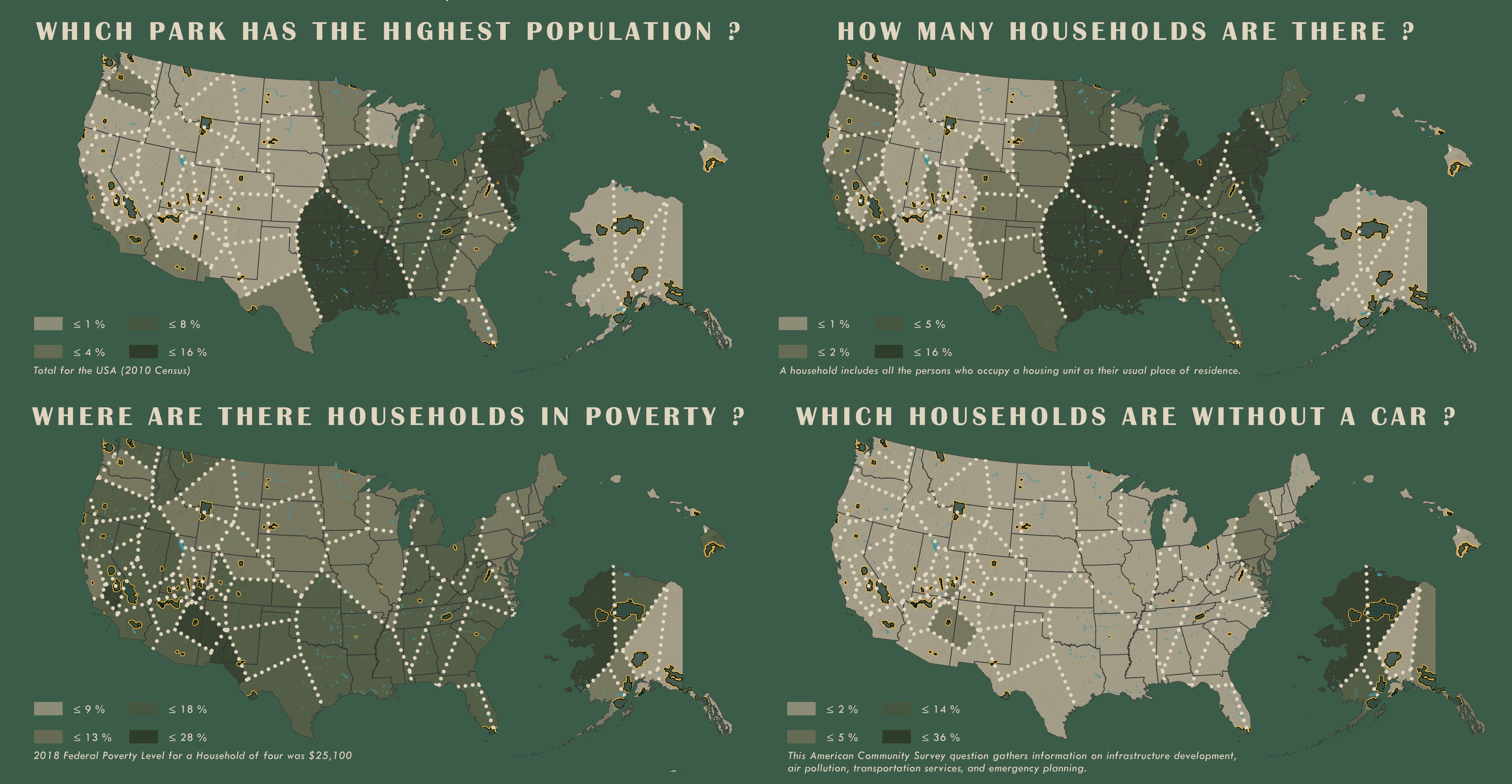 Kobuk Valley and Gates of the Arctic, both National Parks in Alaska, have low amounts of households but those households also have a high rates of poverty.
