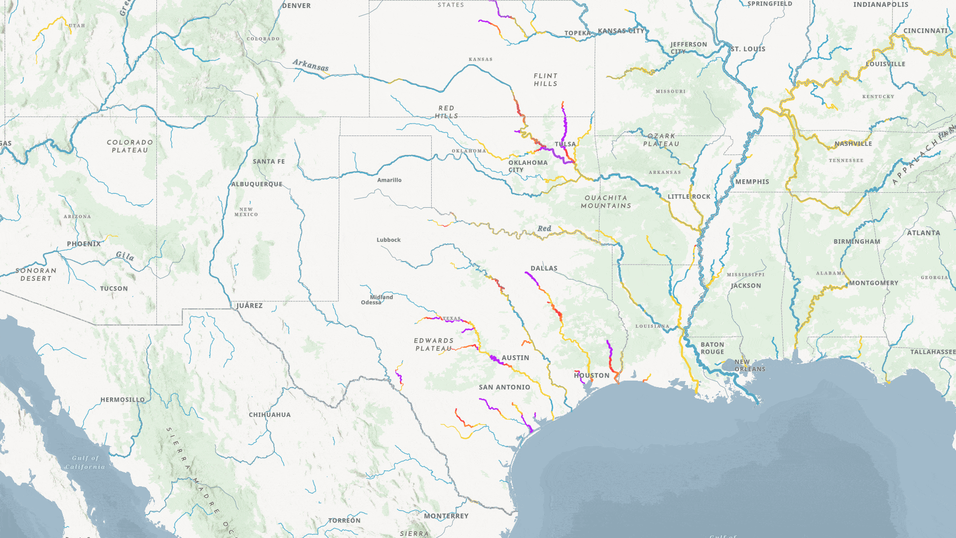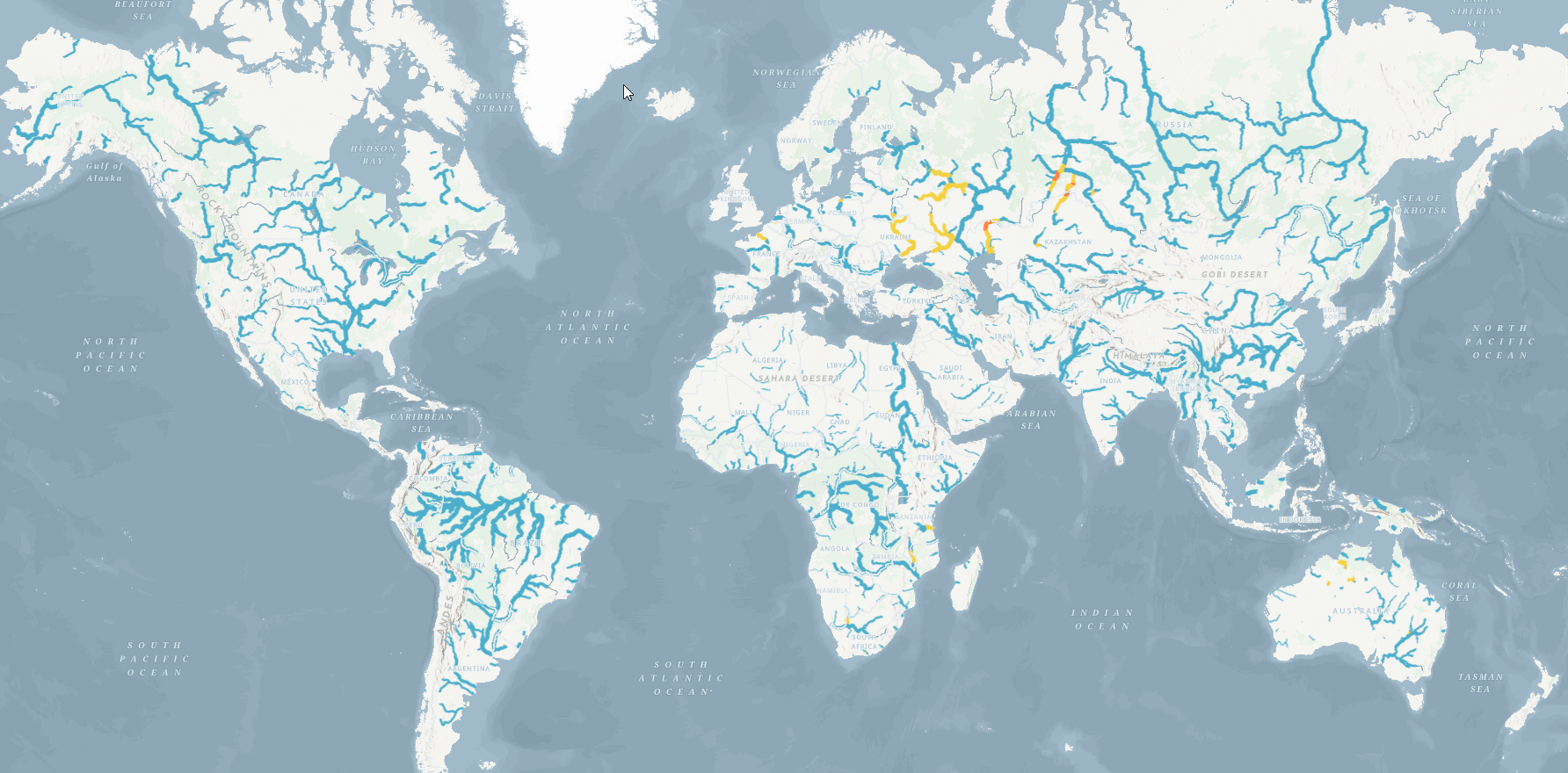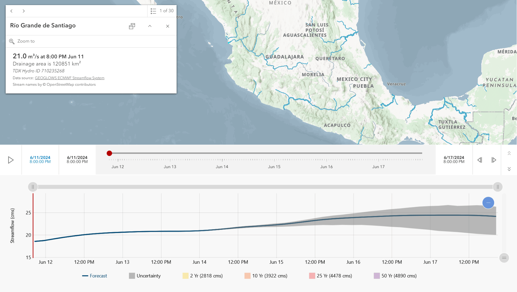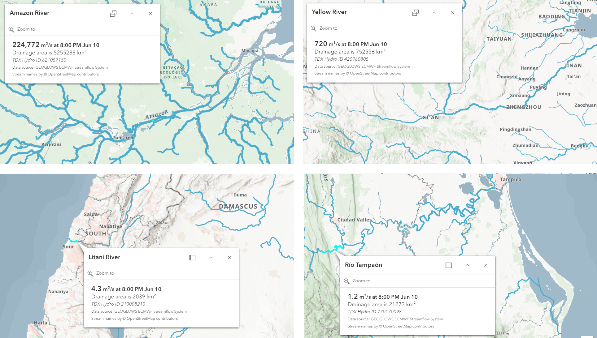 GEOGLOWS 2.0 is a comprehensive streamflow model, its forecast in Living Atlas provides river flow information in three-hour intervals for the next 10 days for around 7 million reaches. The GEOGLOWS Living Atlas layer is a multi-scale service, it displays river names from Open Street Map, can be customized for any geographic region, and the forecast can be plotted using ArcGIS Instant Apps.