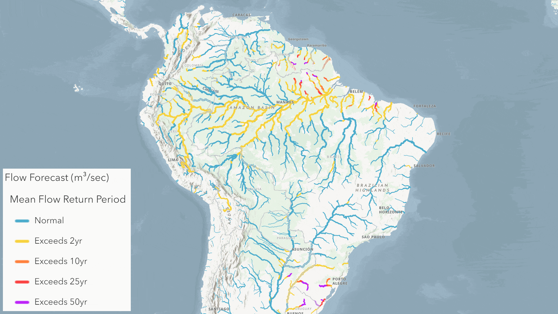The Group on Earth Observations Global Water Sustainability (GEOGLOWS) initiative has recently upgraded its global streamflow model to version two. The GEOGLOWS 10-Day forecast layer is now available in Living Atlas. GEOGLOWS is a comprehensive streamflow model dataset, its forecast provides data in three-hour intervals for the next 10 days. The streamflow predictions in GEOGLOWS are generated using an ensemble approach, where runoff data from the European Centre for Medium-Range Weather Forecasts (ECMWF) is used as input and routed using the RAPID model. The implementation of GEOGLOWS is carried out by the hydroinformatics group at Brigham Young University (BYU).