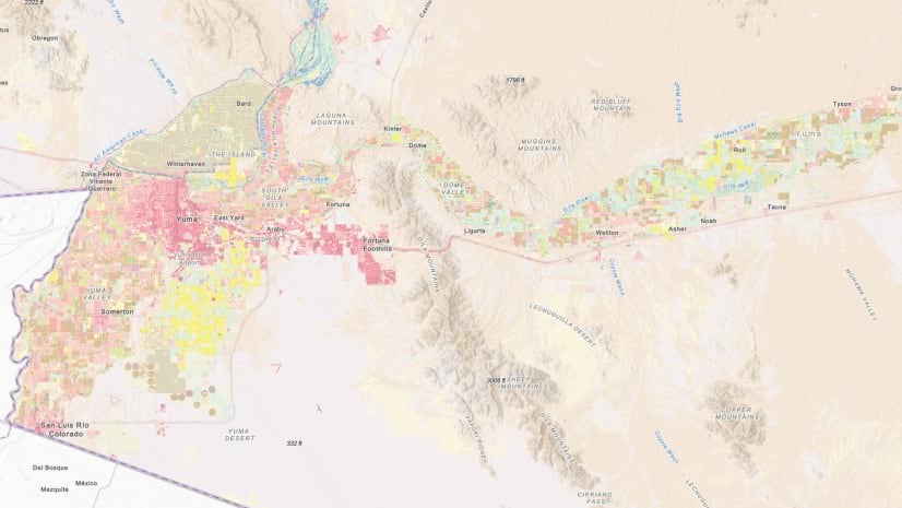 Optional: Apply a processing template that filters out only the fruit crops (including peaches) in the service. Let’s choose the ‘Fruit’ processing template to logically filter the service so that the result contains only fruit crops. To do this, right-click on ‘USA Cropland’ in the table of contents, then choose properties. At the very bottom, click on processing templates. On the right-hand side, you will see the processing template is the analytic renderer. With the dialogue, find the ‘fruit’ template and click ‘ok’. Now your output table will only have fruit crops.