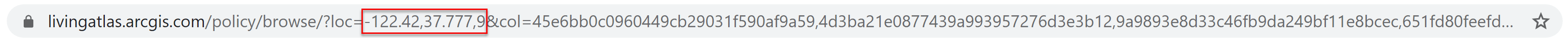 When you establish your area of interest in the collection, the location’s coordinates are automatically added to the URL. When embedding, this location can be changed in the loc= parameter by adding in another location in this section.