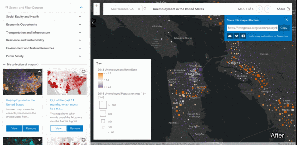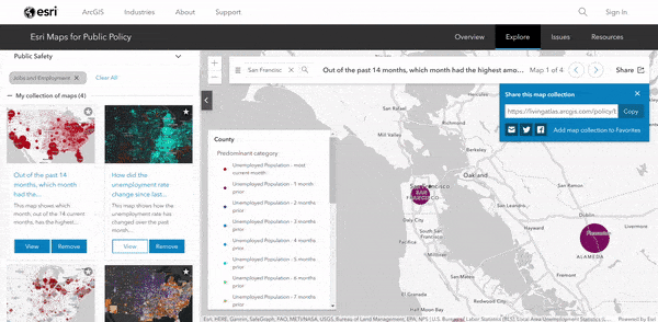 Esri Maps for Public Policy has hundreds of maps available with information on a majority of communities nationwide. The importance of these maps is that they can be tailored to your own community of interest and help reveal facts on a topic that is relevant to the location. Embedding and sharing your collection onto websites and other platforms allows for viewers to easily be able to interact with these meaningful maps.