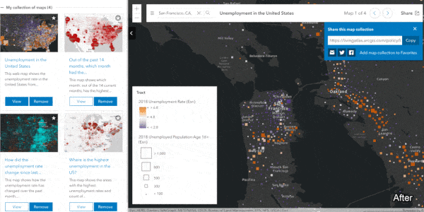 A policy map collection is a great way to create a group of interactive web maps centered on a specific issue. Whether you want to raise awareness on a topic or you simply want to gather information on a community of interest, these map collections offer a unique way to share facts and information on a variety of platforms such as social media, email, and even websites where you can embed the policy map collection’s URL.