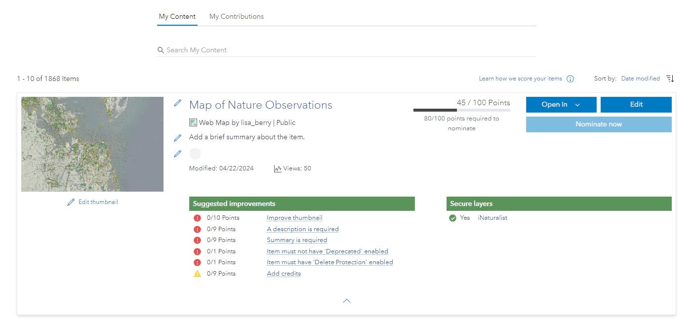 You will see all your ArcGIS Online items here, which you can search or sort to find the item you’d like to nominate. You’ll notice that each item is scored, which is checking for the completion of the components listed in the previous section of this blog. If you completed the steps above, you will see a blue “Nominate now” button, meaning you met the minimum requirements to nominate your content.