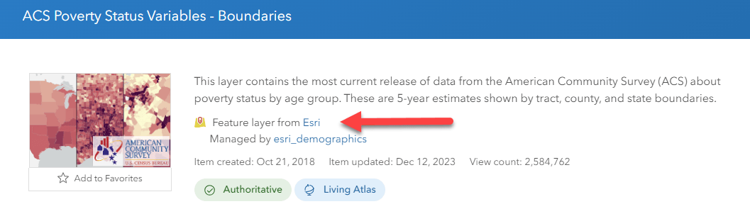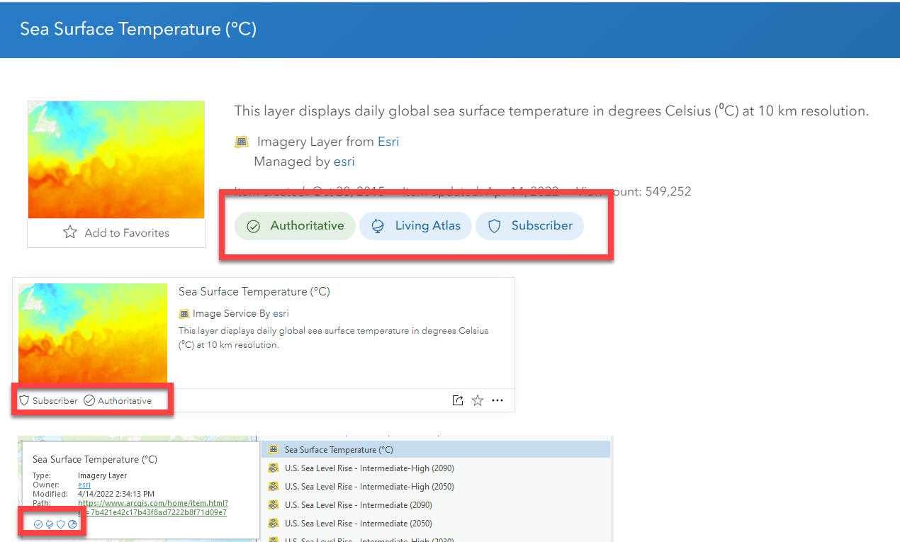 All items within Living Atlas will have a “Living Atlas” badge when you open the item description page, but some items also contain some additional badges next to the item. They may appear slightly different depending on where you are accessing the item (ArcGIS Pro, ArcGIS Online, etc). Here are some helpful hints for understanding what these mean: