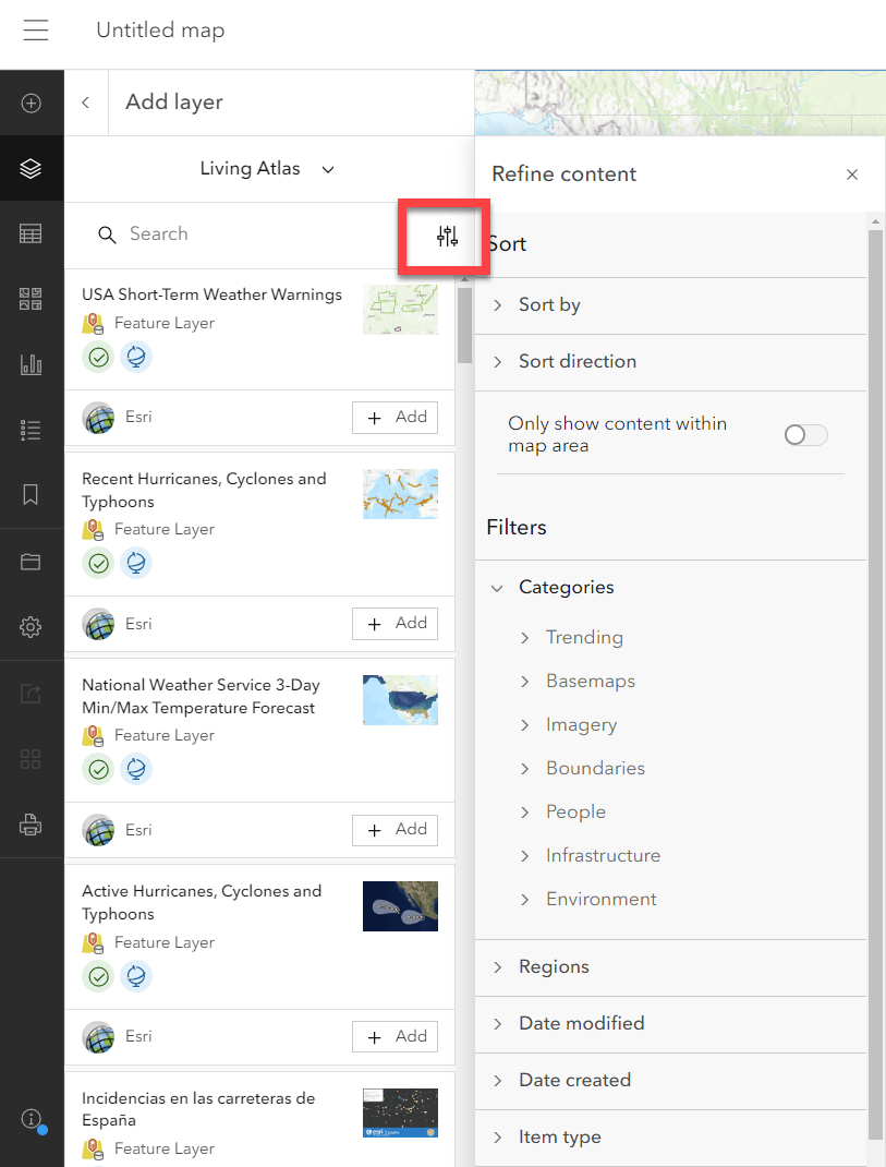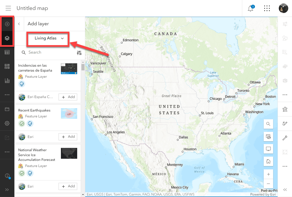 Once you are signed in, you can find Living Atlas layers within the “Add” options in the Table of Contents. Here, you’ll find layers from Living Atlas. For example, feature layers, image layers, imagery layers, etc.
