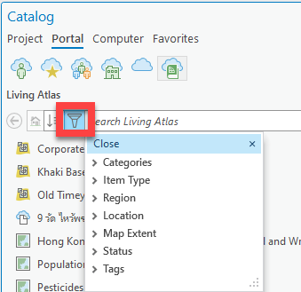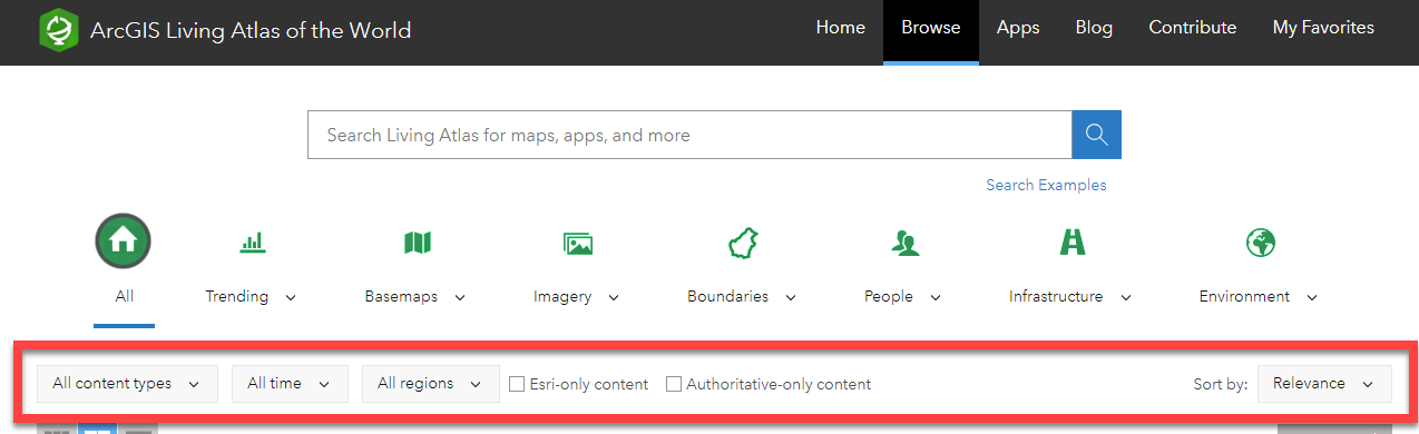 The Living Atlas website provides the most comprehensive view of the Living Atlas collection, and provides extra tools for finding what you need. Use the unique filtering to narrow down your search by time, Esri-only content, and items marked authoritative.
