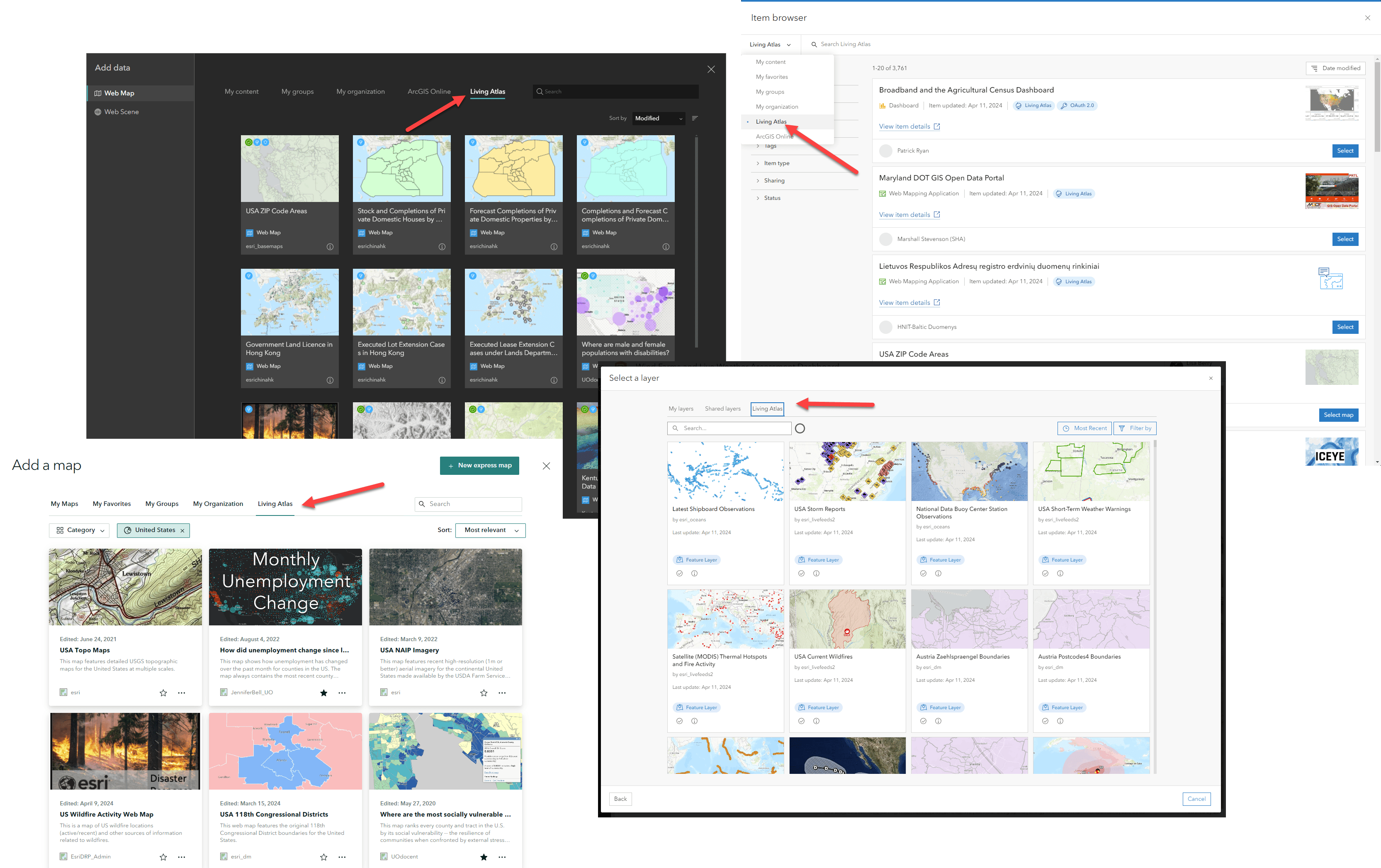 While each product looks a little different in each place you find Living Atlas, there are a few common ways to find the content you need.