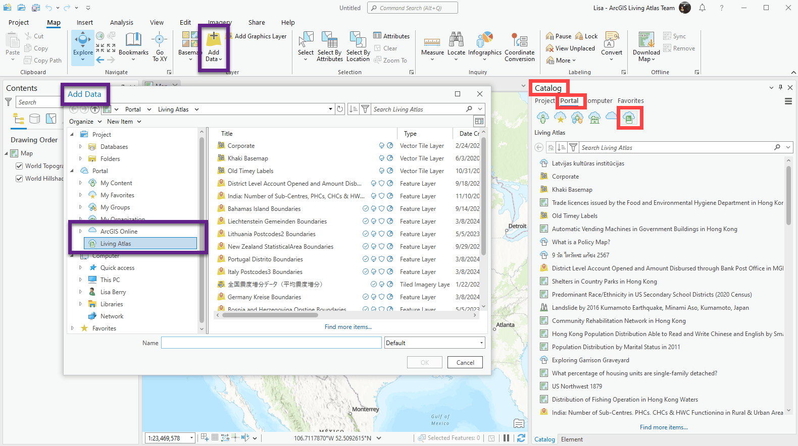 You can find Living Atlas within the ArcGIS Online and Portal options through Add Data or through the Catalog pane.