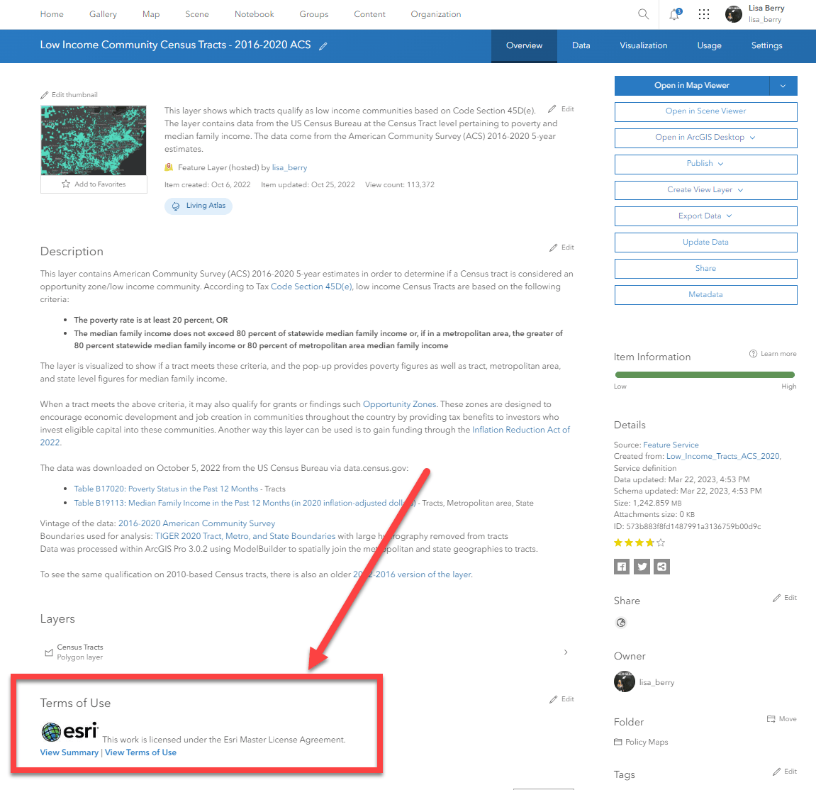 Some items fall under a creative commons license, while items owned by Esri will fall under the Esri Master’s License Agreement. Make sure to visit the links provided to better understand what you can do with an item. In general, you can use and distribute these types of content unless specified otherwise in the Terms of Use.