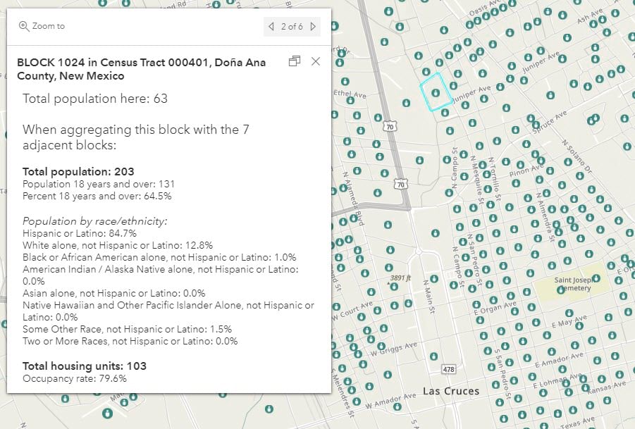 You’ll notice the pop-up on this layer uses Arcade to display aggregated values for the surrounding area rather than values for the block itself: