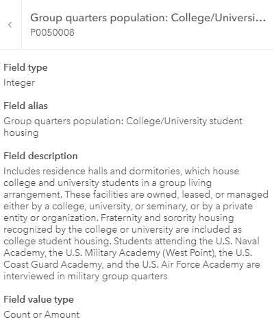 This layer’s aliases and long field descriptions will help you when working with this layer. The field name is the same field name as in the PL files released on Census’ FTP site. The field alias and long description are based on census technical documentation. The field alias is the descriptive name which comes through in things like legends and charts. This information comes through when working in the Map Viewer. Click on the i button next to the attribute to see more information. For example, what exactly is meant by college/university student housing?