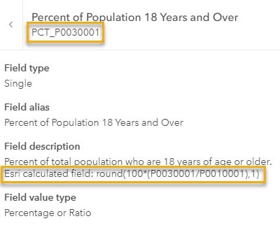 We have provided some calculated fields as well to include basic percentages, for example, the percent of population age 18 and over. These calculated fields all begin with PCT_ in their field name and contain the formula used in the long field description.