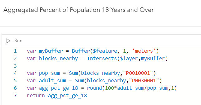 This aggregation is done on-the-fly via a few of Arcade’s geometry functions, specifically Buffer and Intersects. For example, here is the Arcade expression for the Aggregated Percent of Population 18 Years and Over: