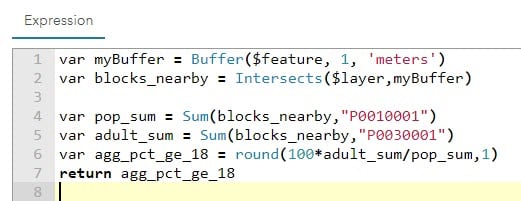 This aggregation is done on-the-fly via a few of Arcade’s geometry functions, specifically Buffer and Intersects. For example, here is the Arcade expression for the Aggregated Percent of Population 18 Years and Over: