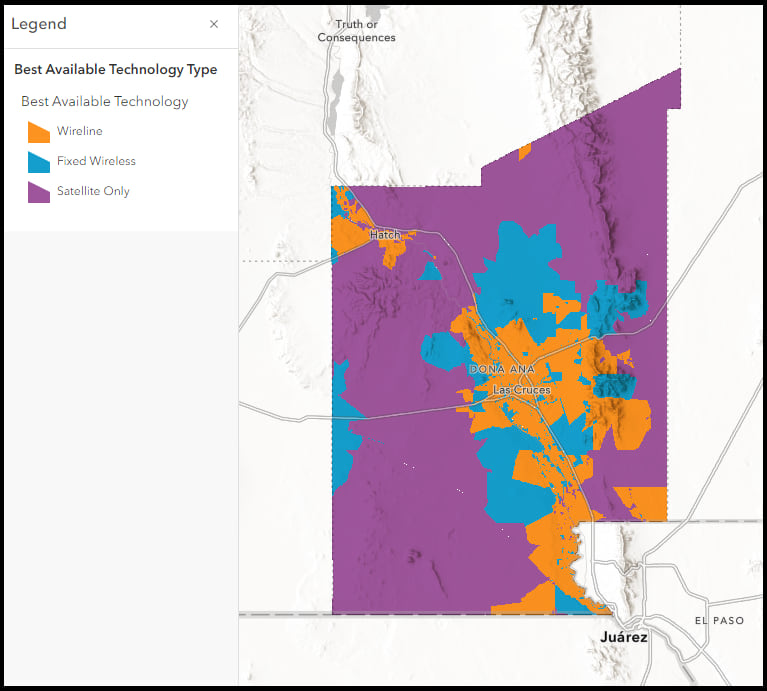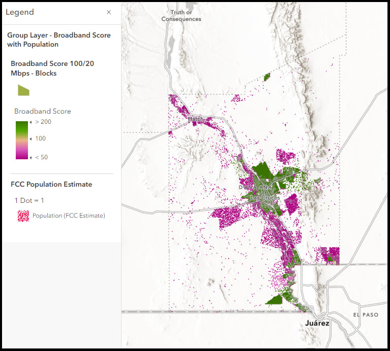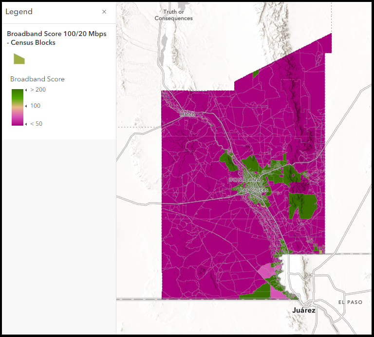 The broadband score can easily be adapted to look at maximum advertised speeds rather than median, and reference any definition of broadband, like 100/20 Mbps. Leveraging the Census Block layer we can apply a filter to an area of interest, a county, for example, and change the visible range to view the data at a smaller scale. In the map below, we have filtered the data by County Geographic Identifier (35013) and changed our visualization to look at maximum advertised speeds with the Broadband Score set to reflect a standard of 100/20 Mbps. The map shows those areas of Doña Ana County, New Mexico that have maximum advertised speeds greater than 100/20 Mbps in green, and those less than in fuchsia.