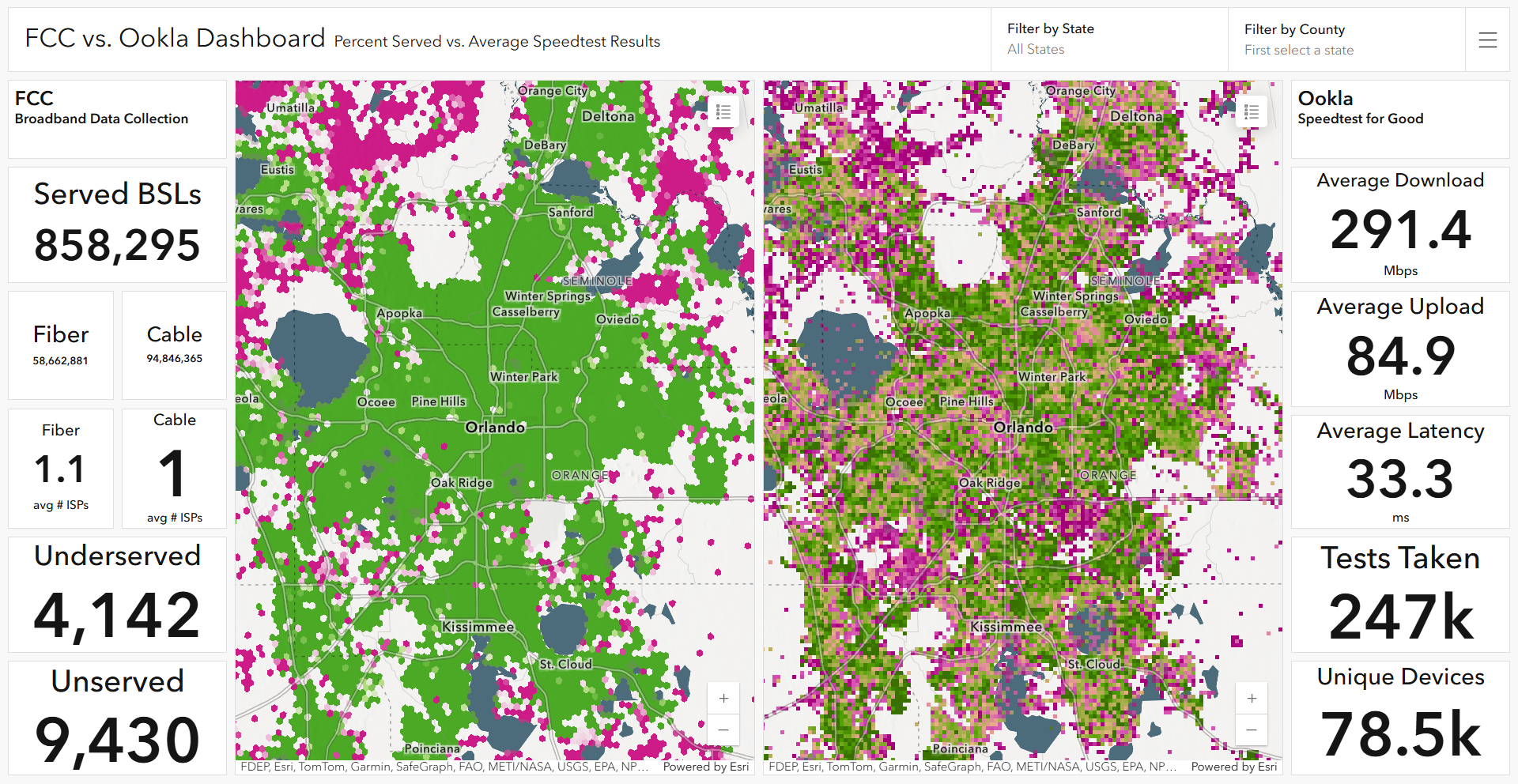 And finally, combine the layer with others from the Living Atlas and you can uncover even more. For example, the dashboard below compares the FCC Broadband Data Collection with Ookla Speedtest for Global Broadband Performance. The dashboard compares the advertised speeds as reported to the Federal Communications Commission with the actual speeds as captured in an Ookla Speedtest. You can check out the dashboard here and additional visualizations of the Ookla data here.