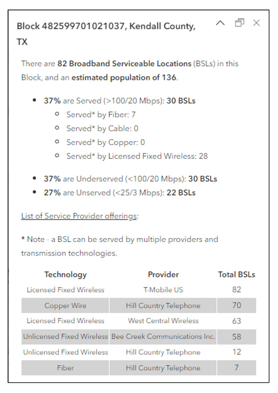 Each geography also has a related table containing records summarizing available service, including provider name, transmission technology, and the number of BSLs where it’s offered. There are also served, underserved, and unserved BSL counts, but they are purely speed-based.