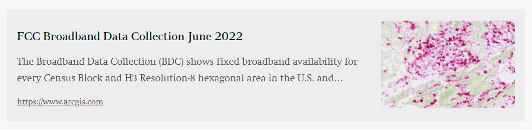 Today, we are excited to announce the addition of the FCC Broadband Data Collection (BDC) in Living Atlas. This layer shows fixed broadband availability for every neighborhood in the U.S. and outlying areas. It summarizes the June 2022 BDC data showing the number of served, underserved, and unserved Broadband Serviceable Locations (BSLs) by transmission technology in a given geography. It is a composite of six sublayers – State, County, Tract, Block Group, Block, and H3 Resolution-8 hexagonal areas – with adjacent scale ranges, each with a related table listing all provider service offerings in a geography.