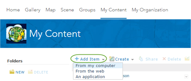 To store and use photos in ArcGIS Online maps simply log in, go to My Content, click the Add Item button, and select From my computer in the drop-down menu.