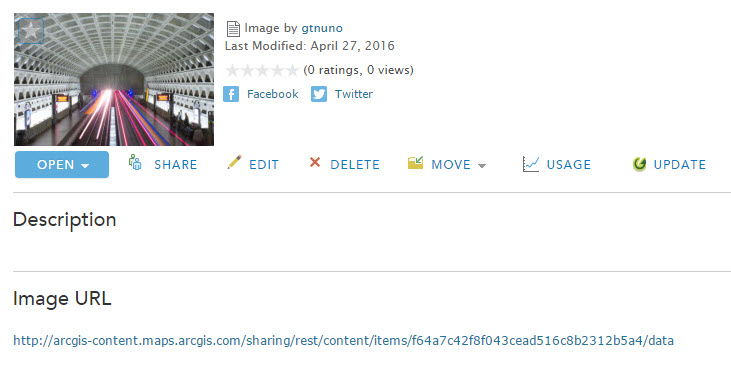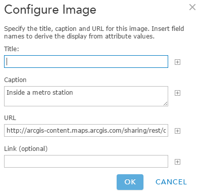 Select your photo by copying and pasting the URL from the photo item you created in My Content, click the plus sign, and click OK. Save your changes to the layer and the map.